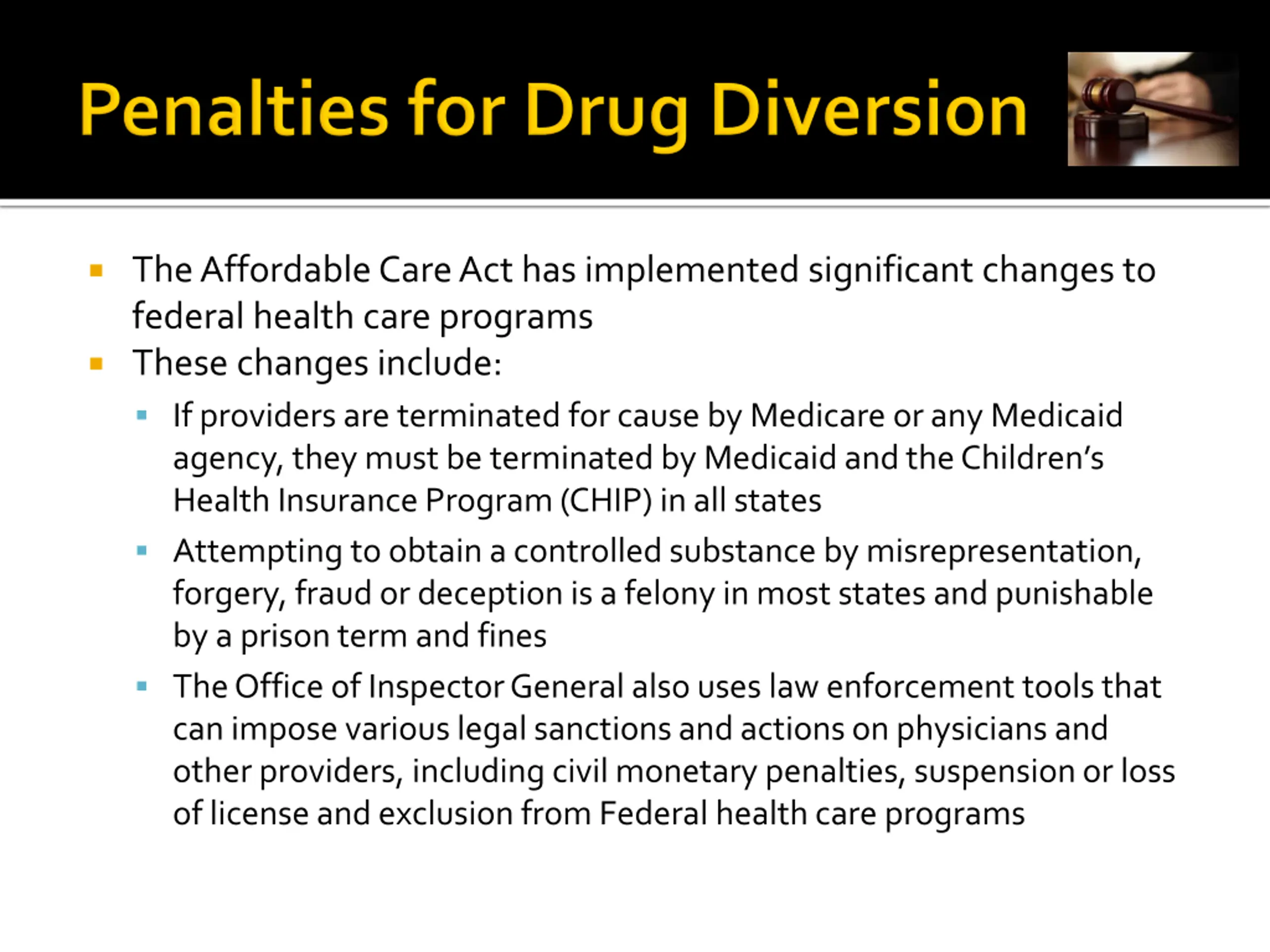 The Affordable Care Act has implemented significant changes to federal health care programs These changes include: If providers are terminated for cause by Medicare or any Medicaid agency, they must be terminated by Medicaid and the Children s Health Insurance Program (CHIP) in all states Attempting to obtain a controlled substance by misrepresentation, forgery, fraud or deception is a felony in most states and punishable by a prison term and fines The Office of Inspector General also uses law enforcement tools that can impose various legal sanctions and actions on physicians and other providers, including civil monetary penalties, suspension or loss of license and exclusion from Federal health care programs