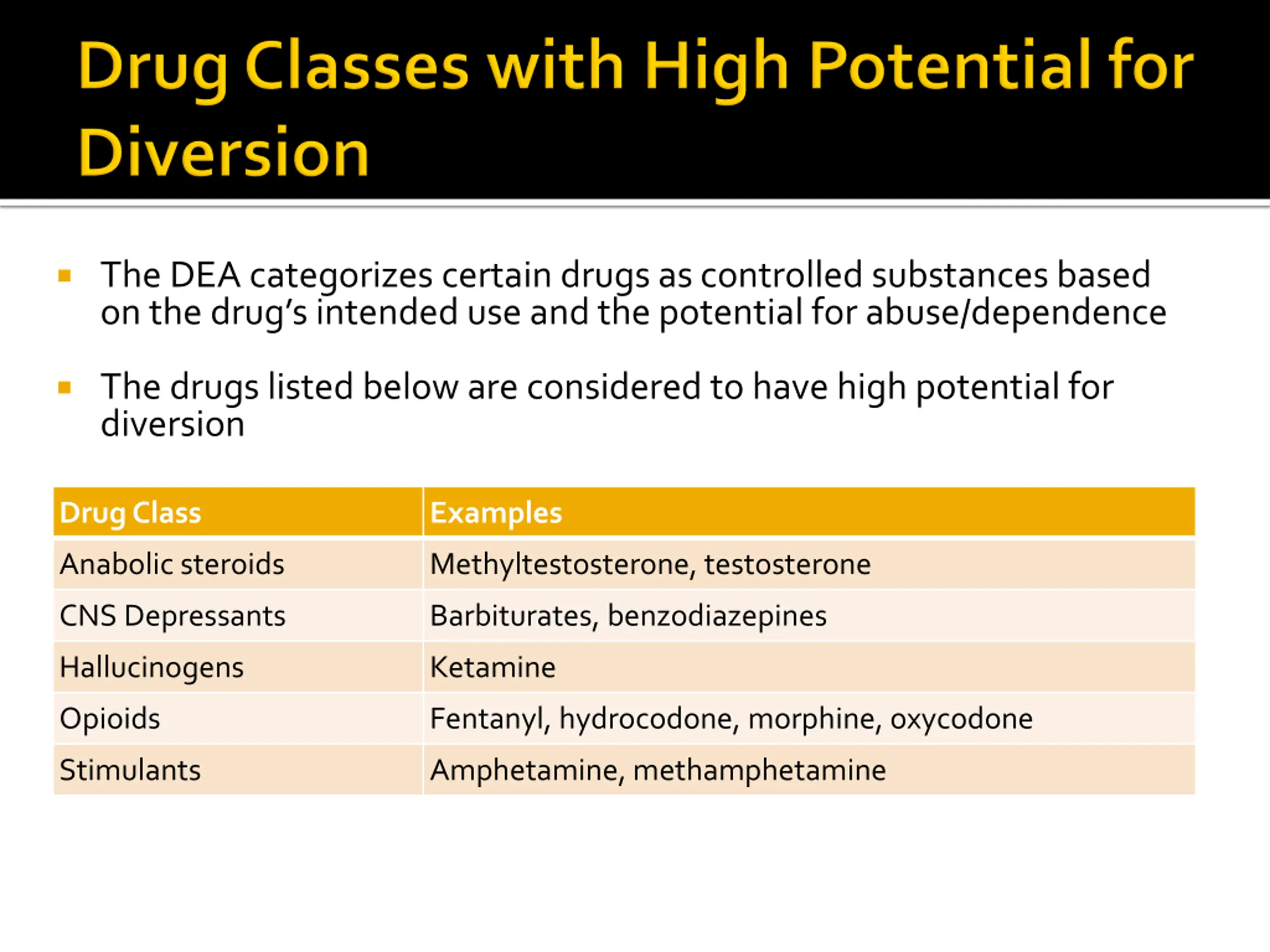 The DEA categorizes certain drugs as controlled substances based on the drug s intended use and the potential for abuse/dependence The drugs listed below are considered to have high potential for diversion Drug Class Examples Anabolic steroids Methyltestosterone, testosterone CNS Depressants Barbiturates, benzodiazepines Hallucinogens Ketamine Opioids Fentanyl, hydrocodone, morphine, oxycodone Stimulants Amphetamine, methamphetamine