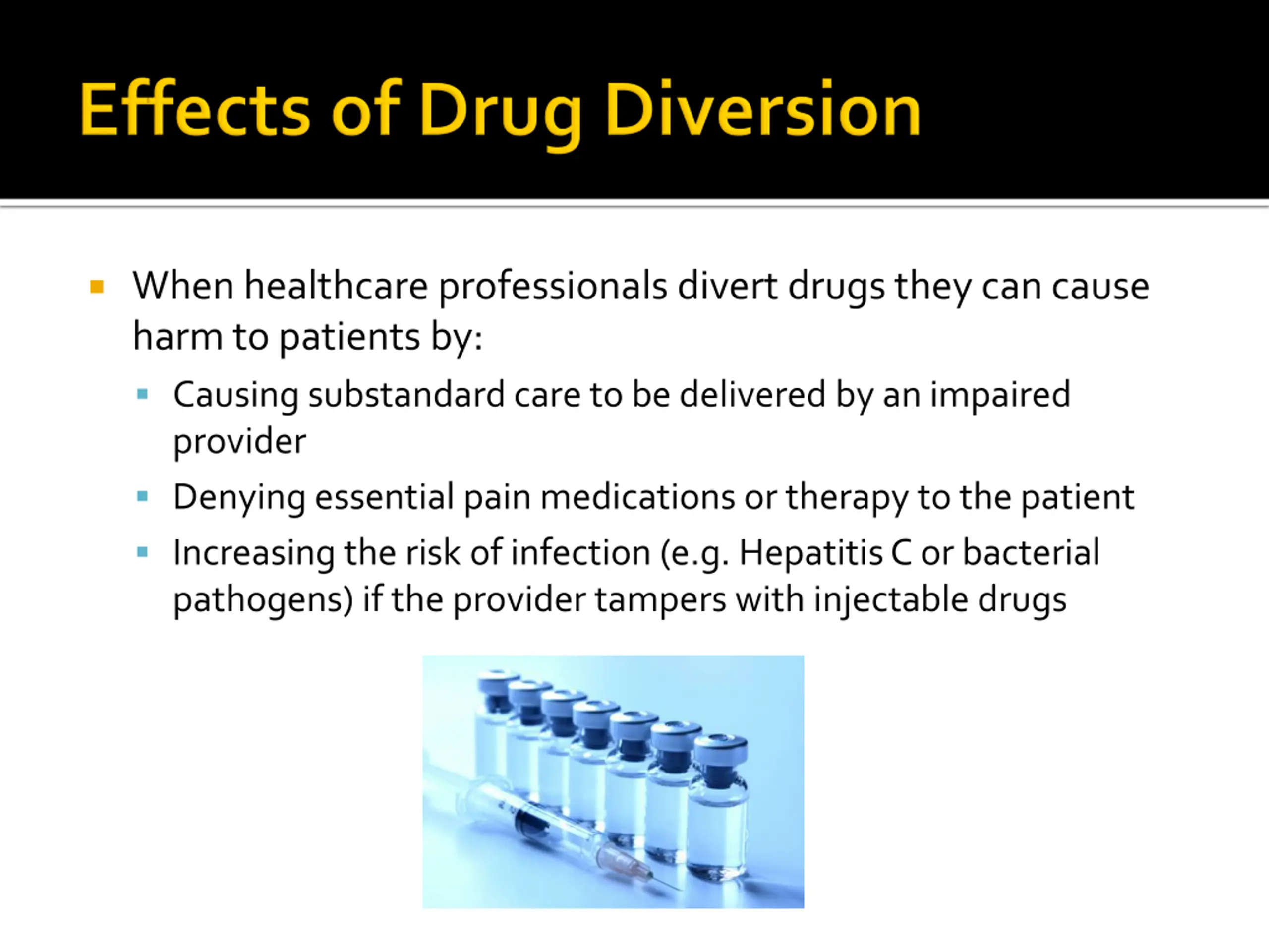 When healthcare professionals divert drugs they can cause harm to patients by: Causing substandard care to be delivered by an impaired provider Denying essential pain medications or therapy to the patient Increasing the risk of infection (e.g. Hepatitis C or bacterial pathogens) if the provider tampers with injectable drugs