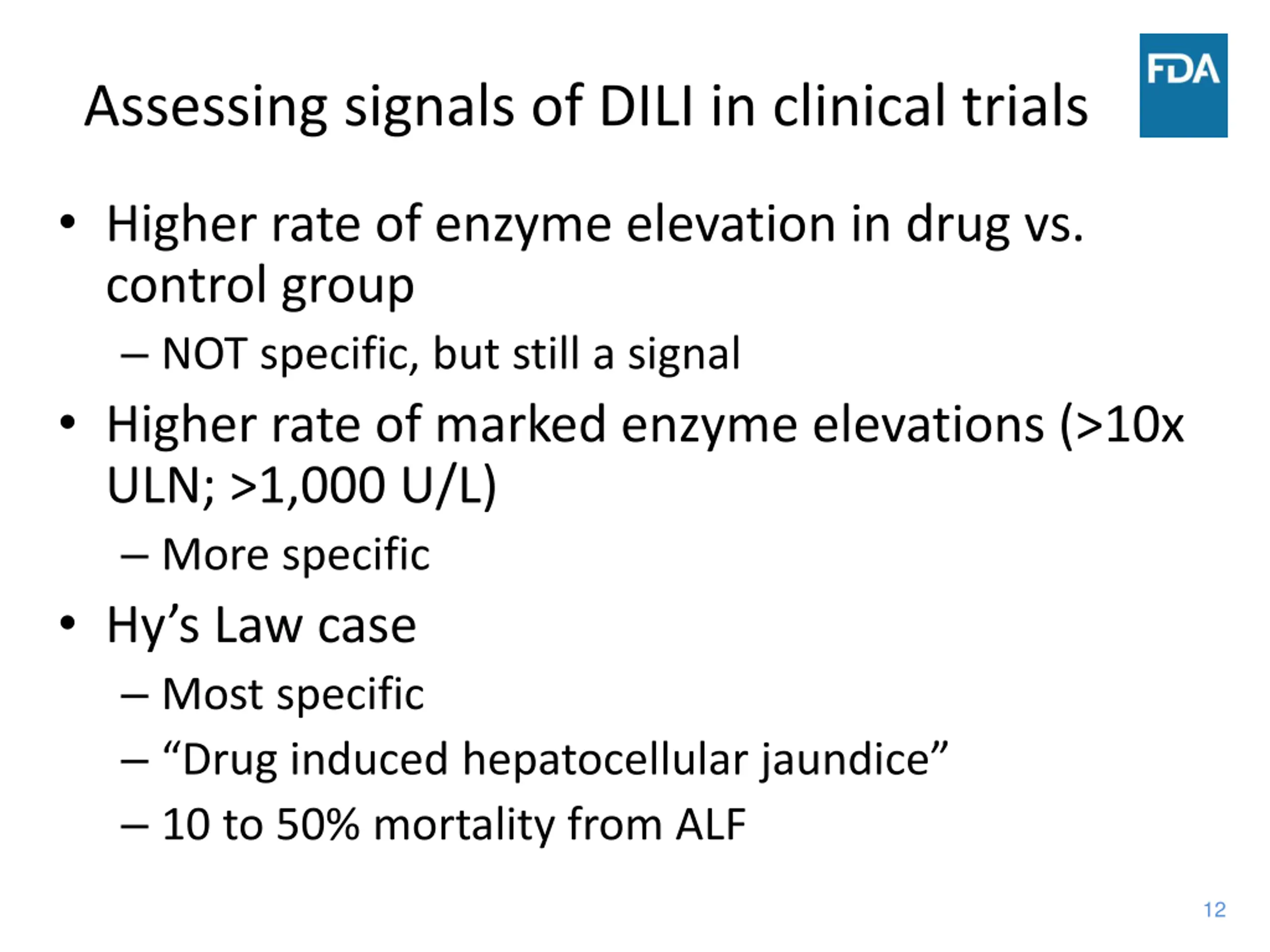 Assessing signals of DILI in clinical trials Higher rate of enzyme elevation in drug vs. control group NOT specific, but still a signal Higher rate of marked enzyme elevations (>10x ULN; >1,000 U/L) More specific Hy s Law case Most specific Drug induced hepatocellular jaundice 10 to 50% mortality from ALF 12