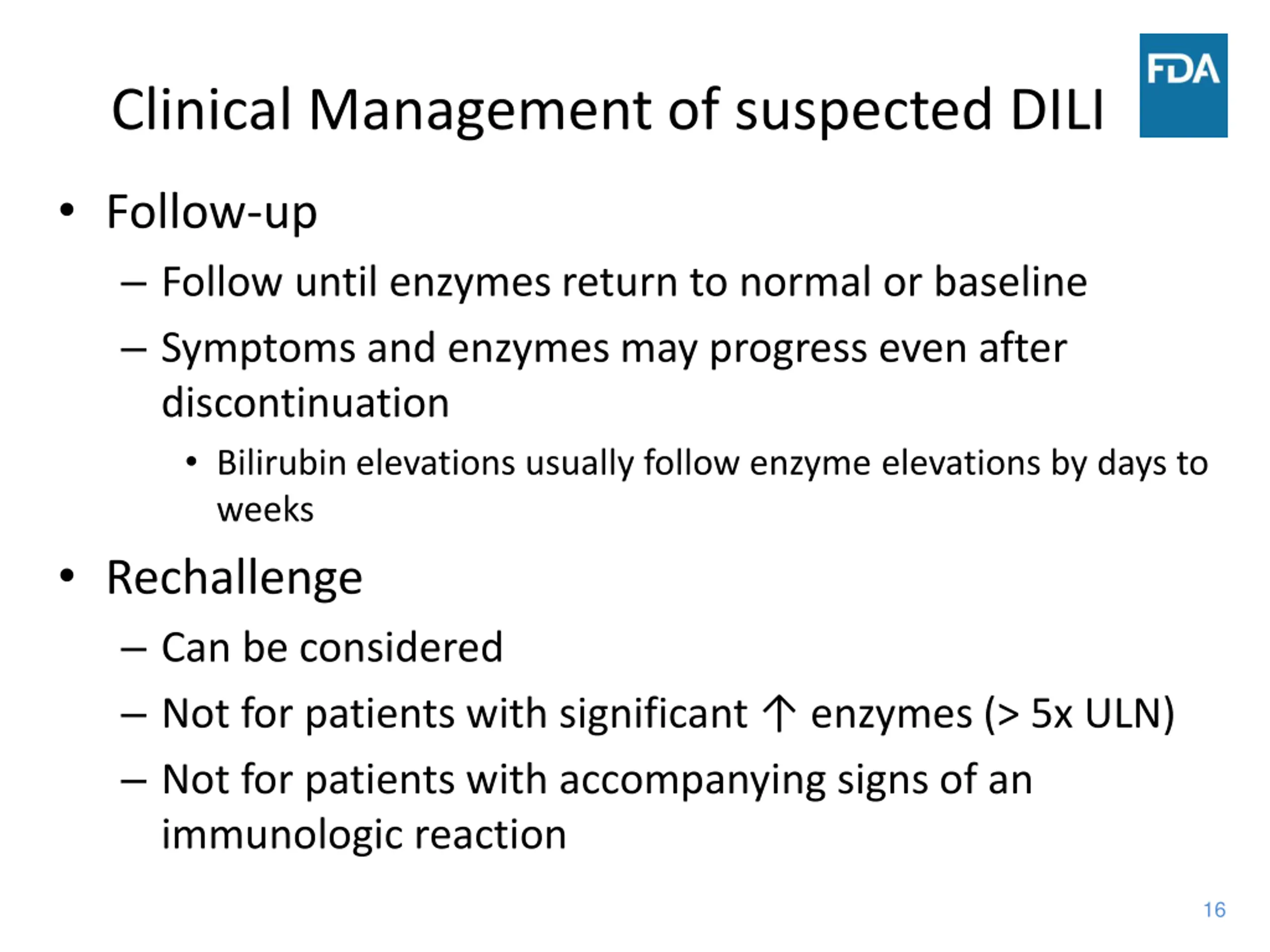 Clinical Management of suspected DILI Drug discontinuation Automatically stopping drug with >3xULN increase may be unnecessary Liver can adapt and become tolerant Close observation warranted Prevent progression to functional impairment Generally, d/c drug if: ALT/AST > 8x ULN ALT/AST > 5x ULN for more than 2 weeks ALT/AST >3x ULN and (total bili >2x ULN or INR > 1.5) ALT/AST >3x ULN with symptoms 15