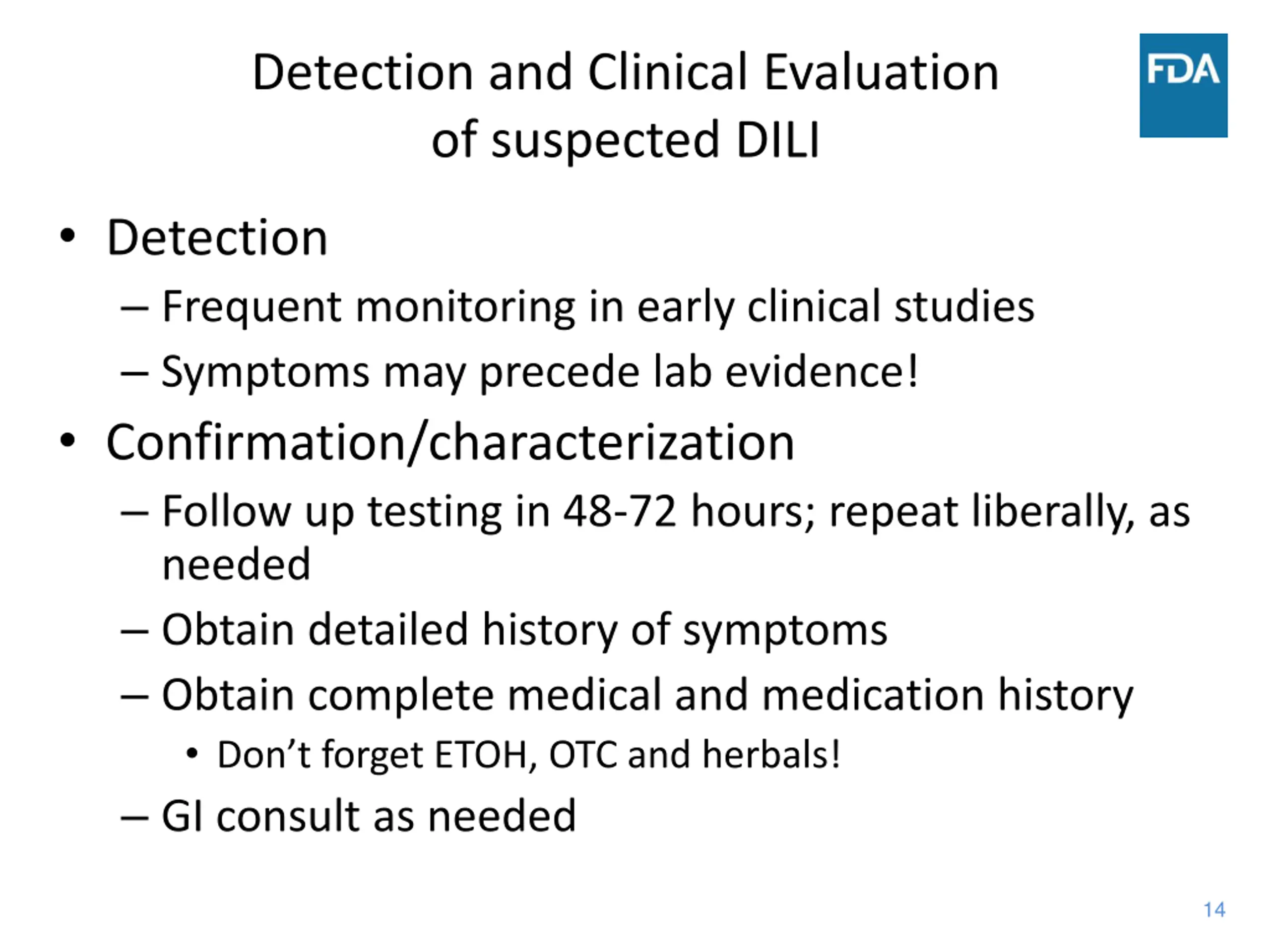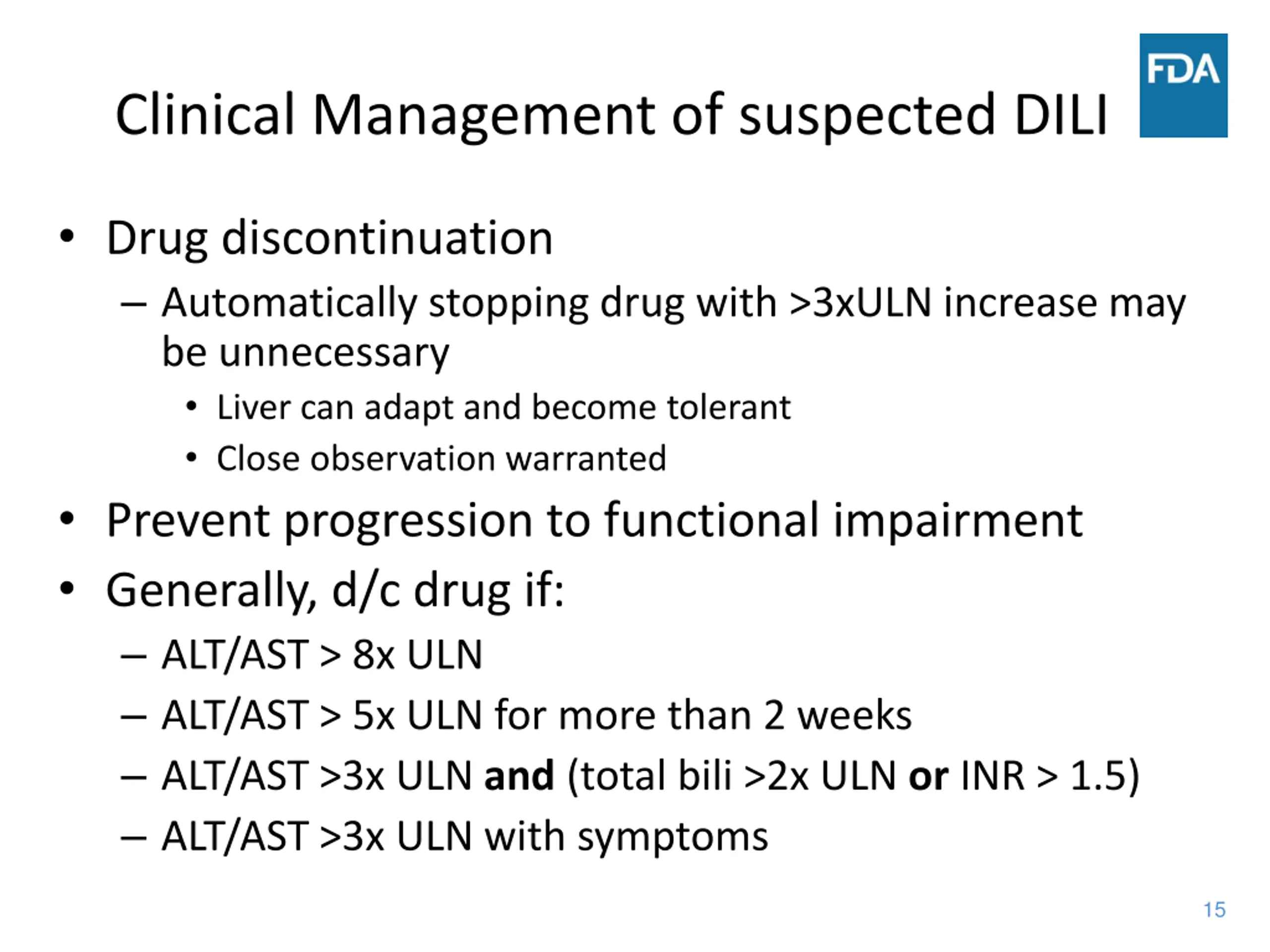 Detection and Clinical Evaluation of suspected DILI Detection Frequent monitoring in early clinical studies Symptoms may precede lab evidence! Confirmation/characterization Follow up testing in 48-72 hours; repeat liberally, as needed Obtain detailed history of symptoms Obtain complete medical and medication history Don t forget ETOH, OTC and herbals! GI consult as needed 14