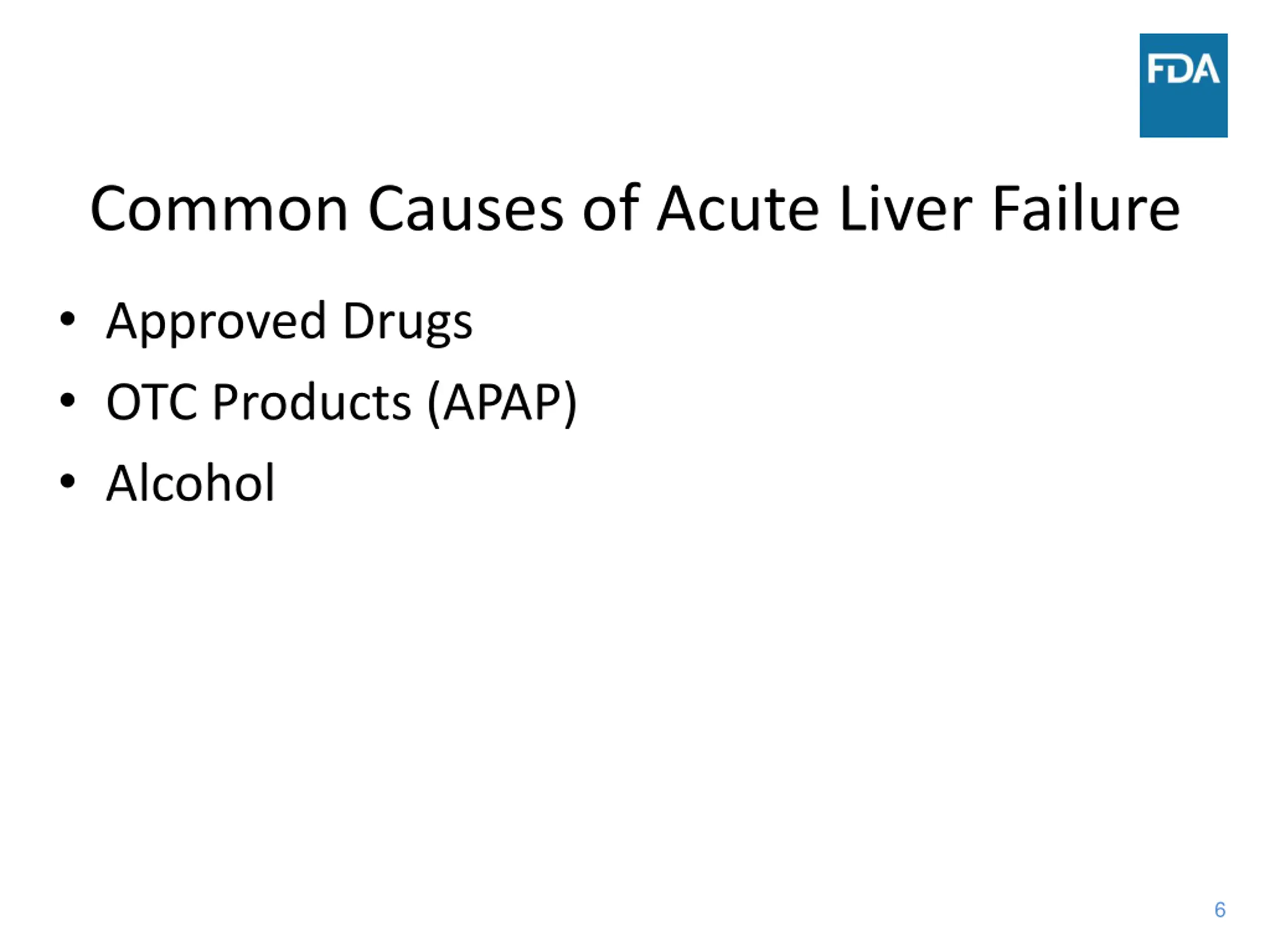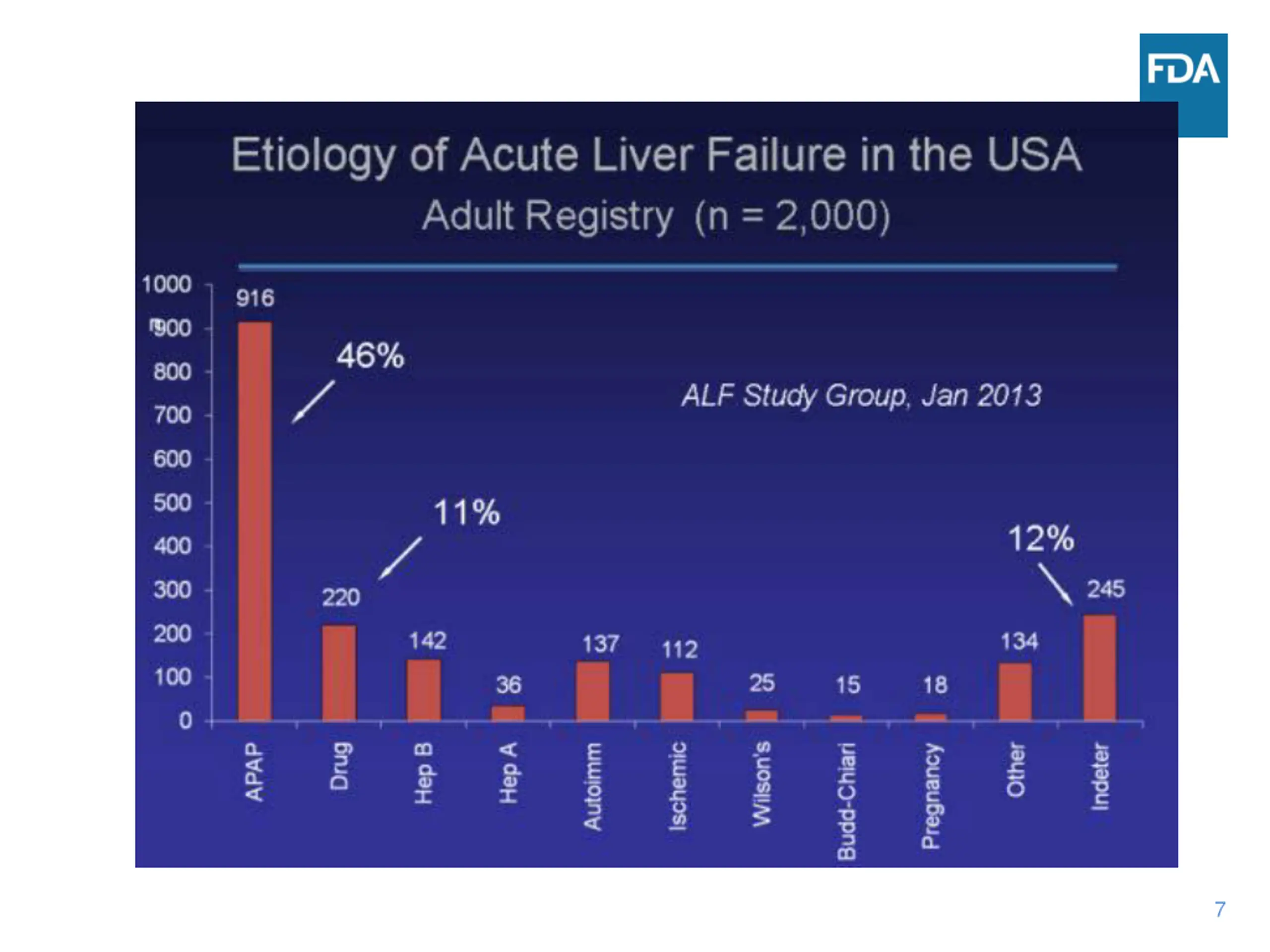 Common Causes of Acute Liver Failure Approved Drugs OTC Products (APAP) Alcohol 6