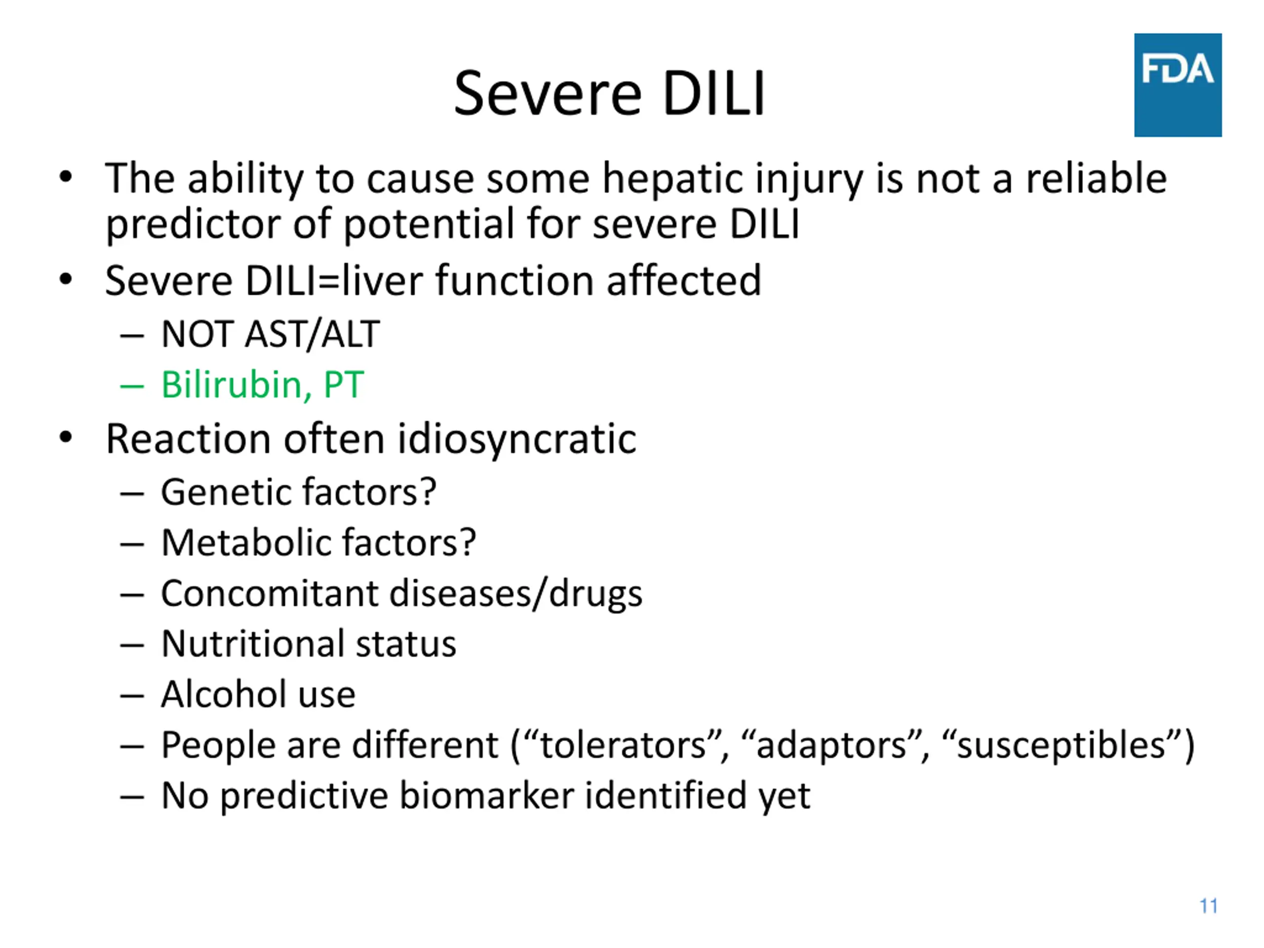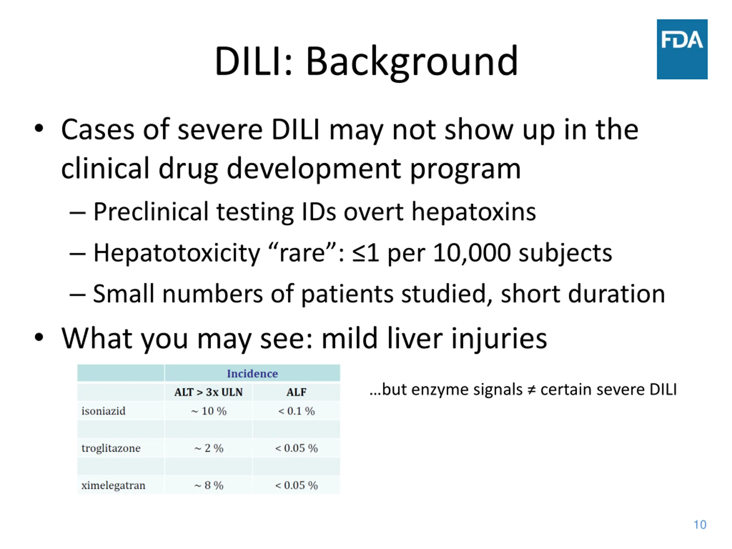 DILI: Background Cases of severe DILI may not show up in the clinical drug development program Preclinical testing IDs overt hepatoxins Hepatotoxicity rare : 1 per 10,000 subjects Small numbers of patients studied, short duration What you may see: mild liver injuries but enzyme signals certain severe DILI 10