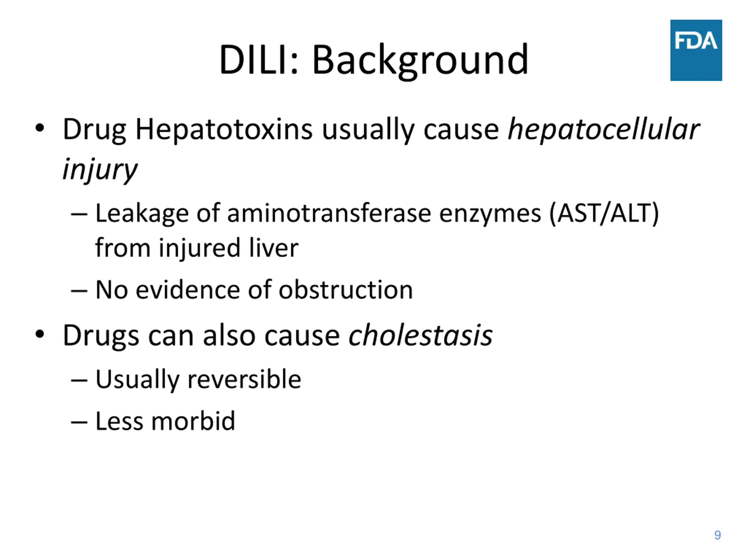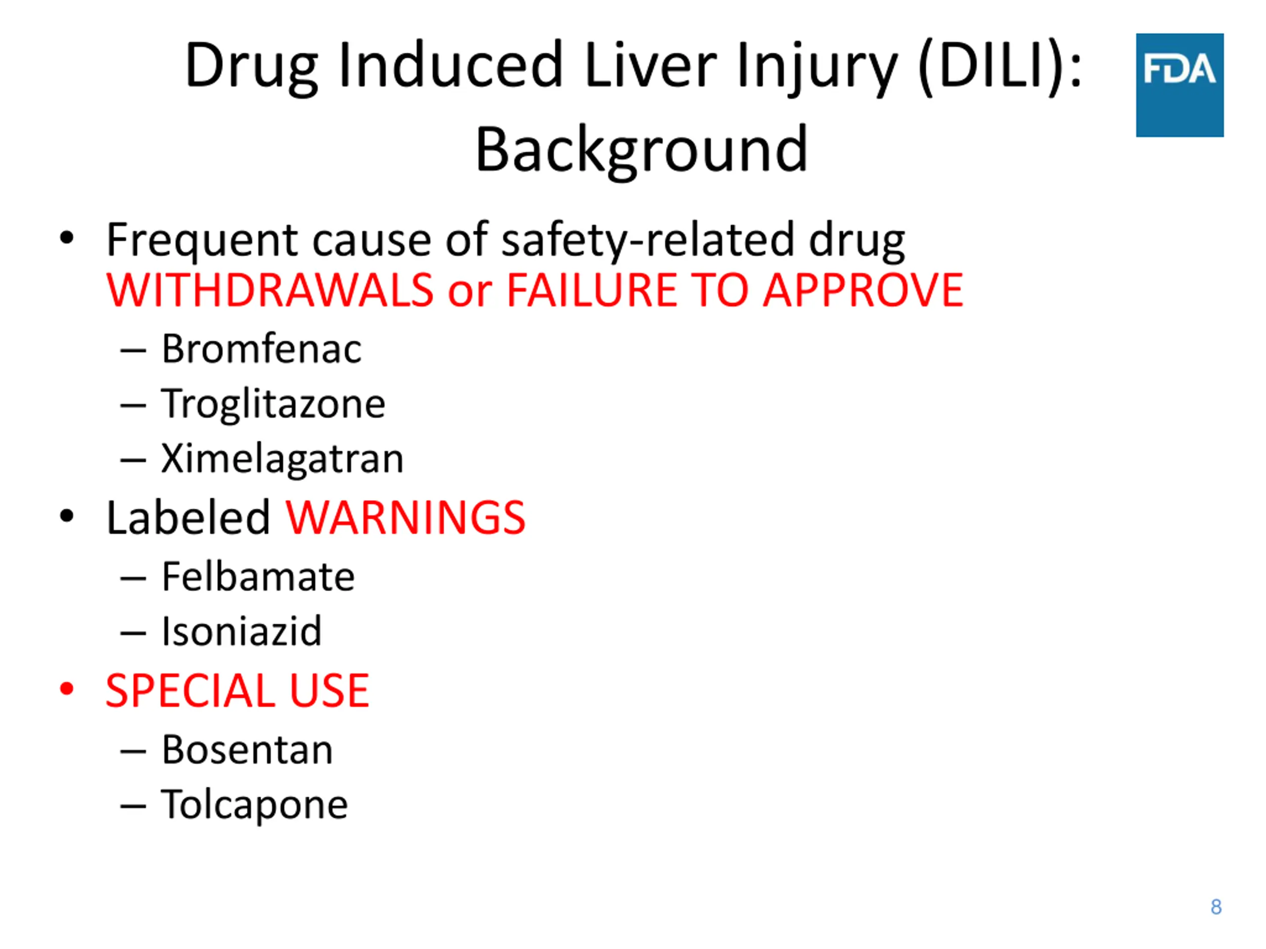 Drug Induced Liver Injury (DILI): Background Frequent cause of safety-related drug WITHDRAWALS or FAILURE TO APPROVE Bromfenac Troglitazone Ximelagatran Labeled WARNINGS Felbamate Isoniazid SPECIAL USE Bosentan Tolcapone 8