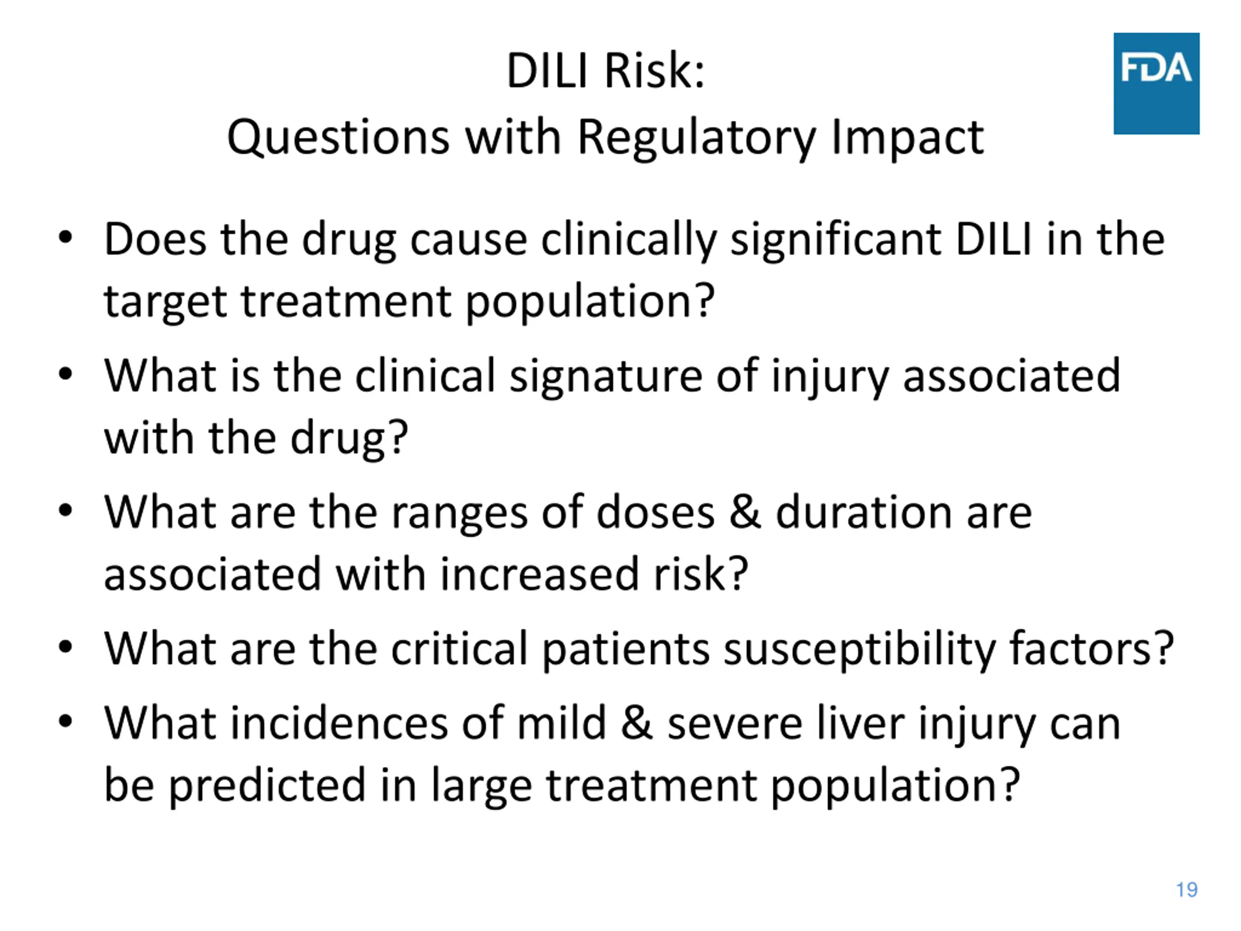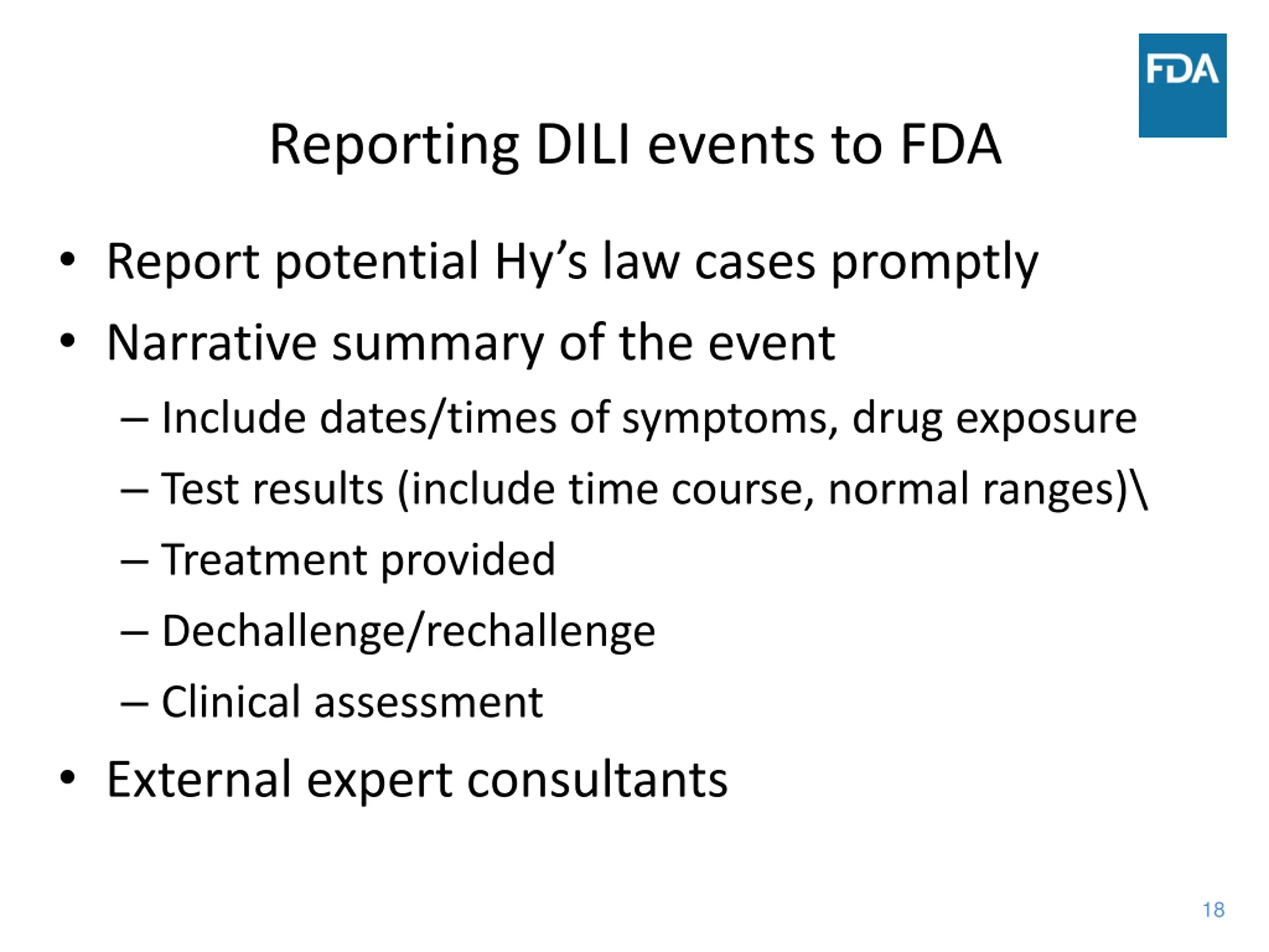 Reporting DILI events to FDA Report potential Hy s law cases promptly Narrative summary of the event Include dates/times of symptoms, drug exposure Test results (include time course, normal ranges)\ Treatment provided Dechallenge/rechallenge Clinical assessment External expert consultants 18