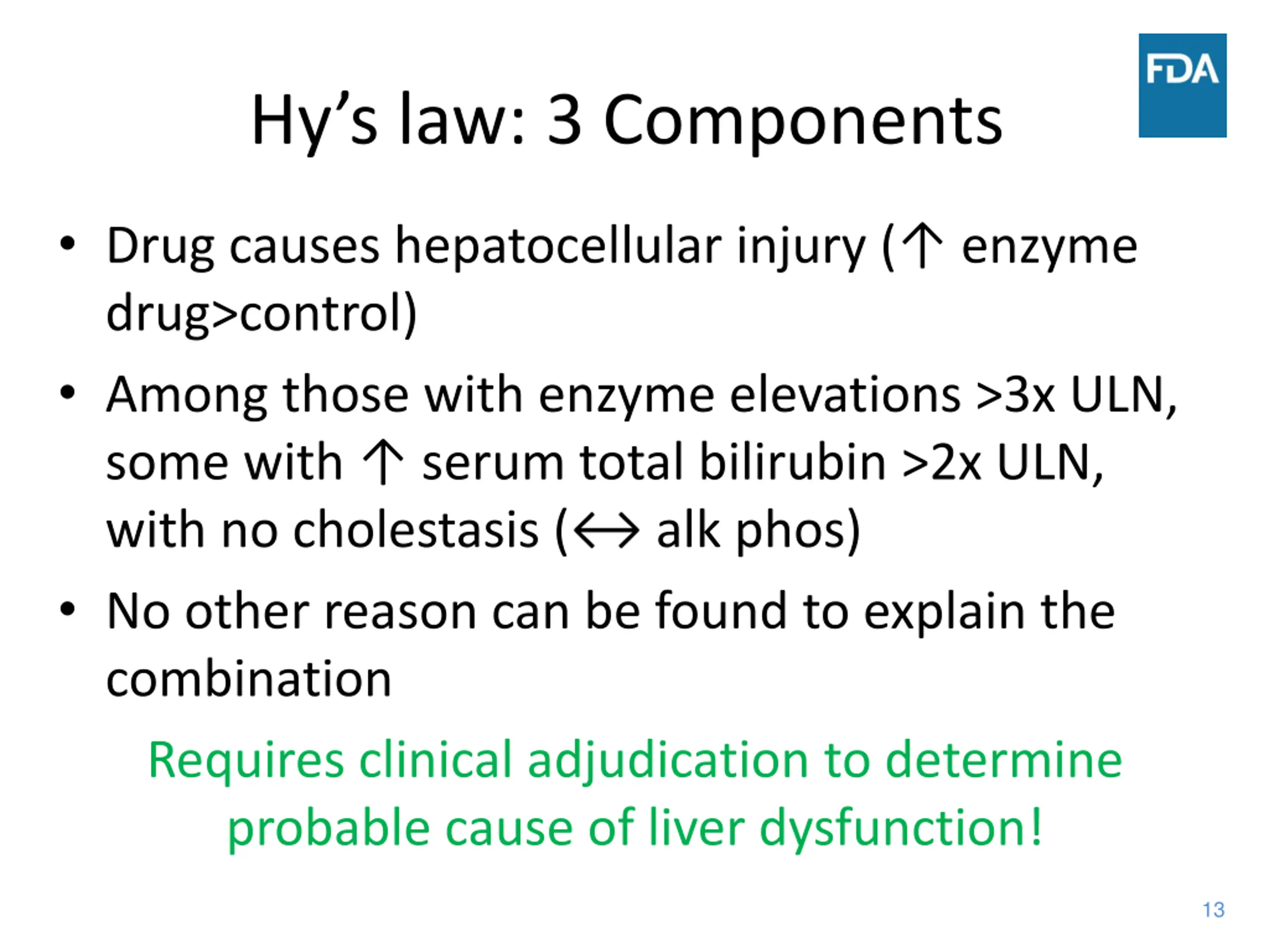 Hys law: 3 Components Drug causes hepatocellular injury ( enzyme drug>control) Among those with enzyme elevations >3x ULN, some with serum total bilirubin >2x ULN, with no cholestasis ( No other reason can be found to explain the combination Requires clinical adjudication to determine probable cause of liver dysfunction! alk phos) 13