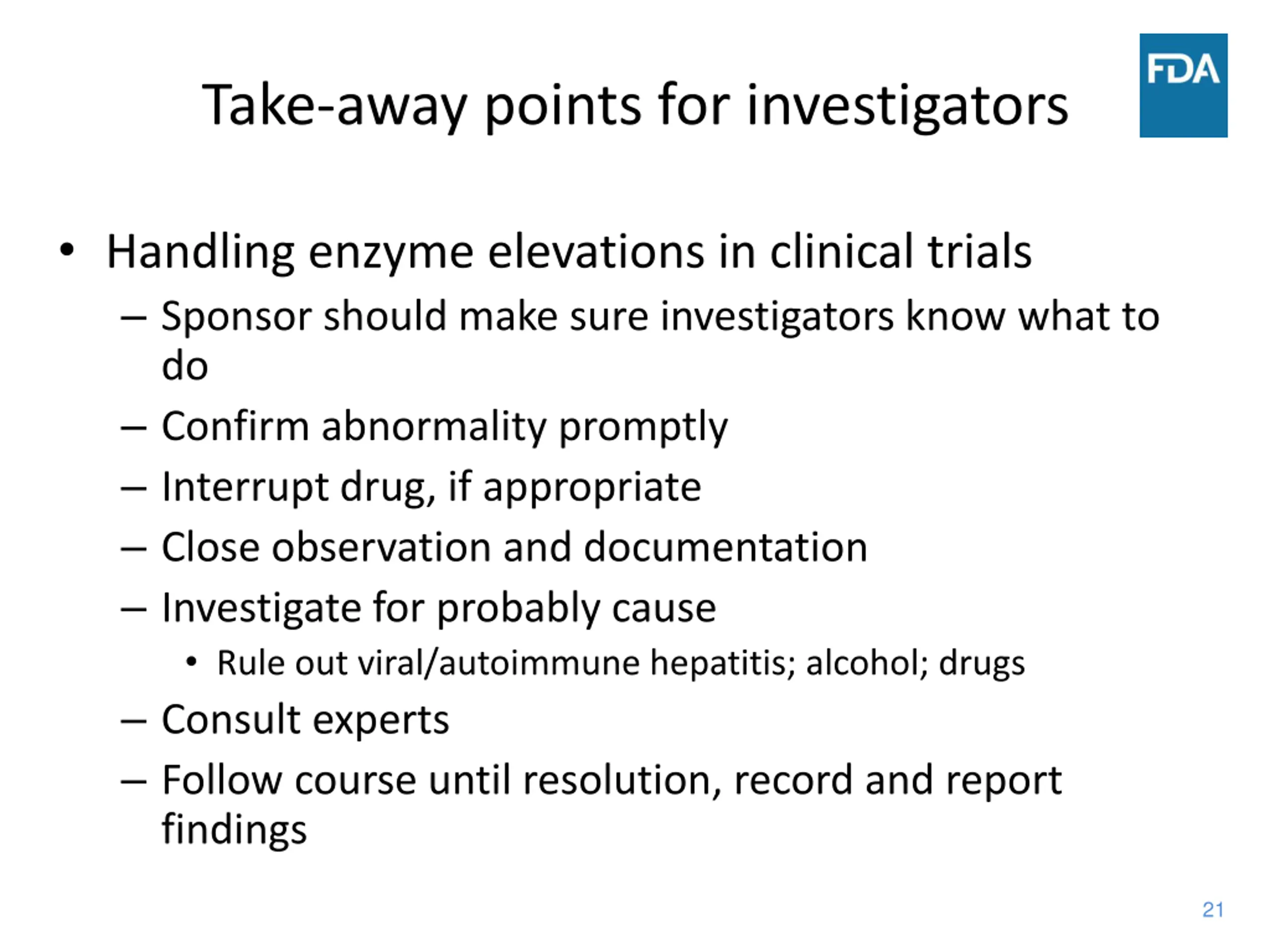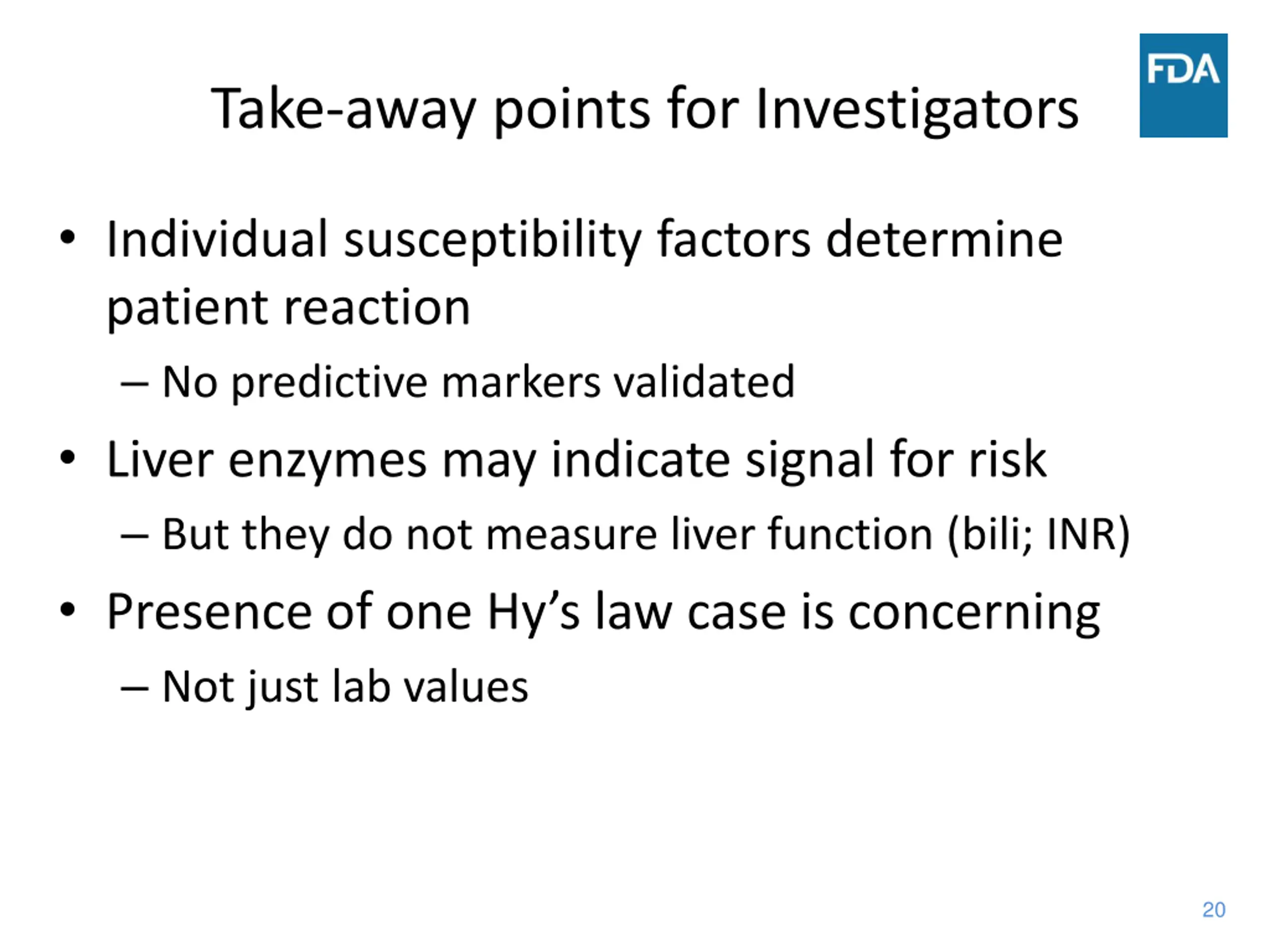 Take-away points for Investigators Individual susceptibility factors determine patient reaction No predictive markers validated Liver enzymes may indicate signal for risk But they do not measure liver function (bili; INR) Presence of one Hy s law case is concerning Not just lab values 20