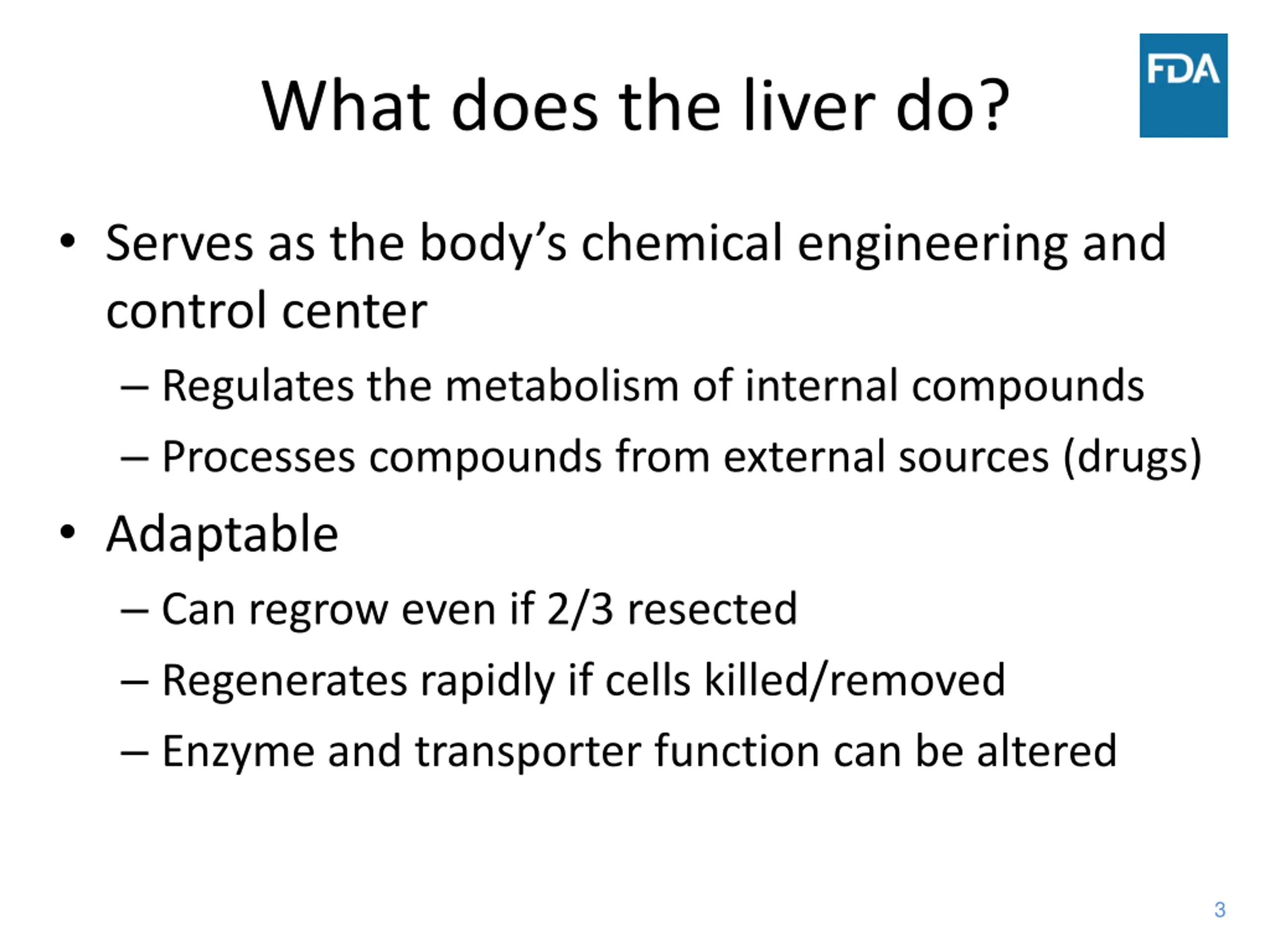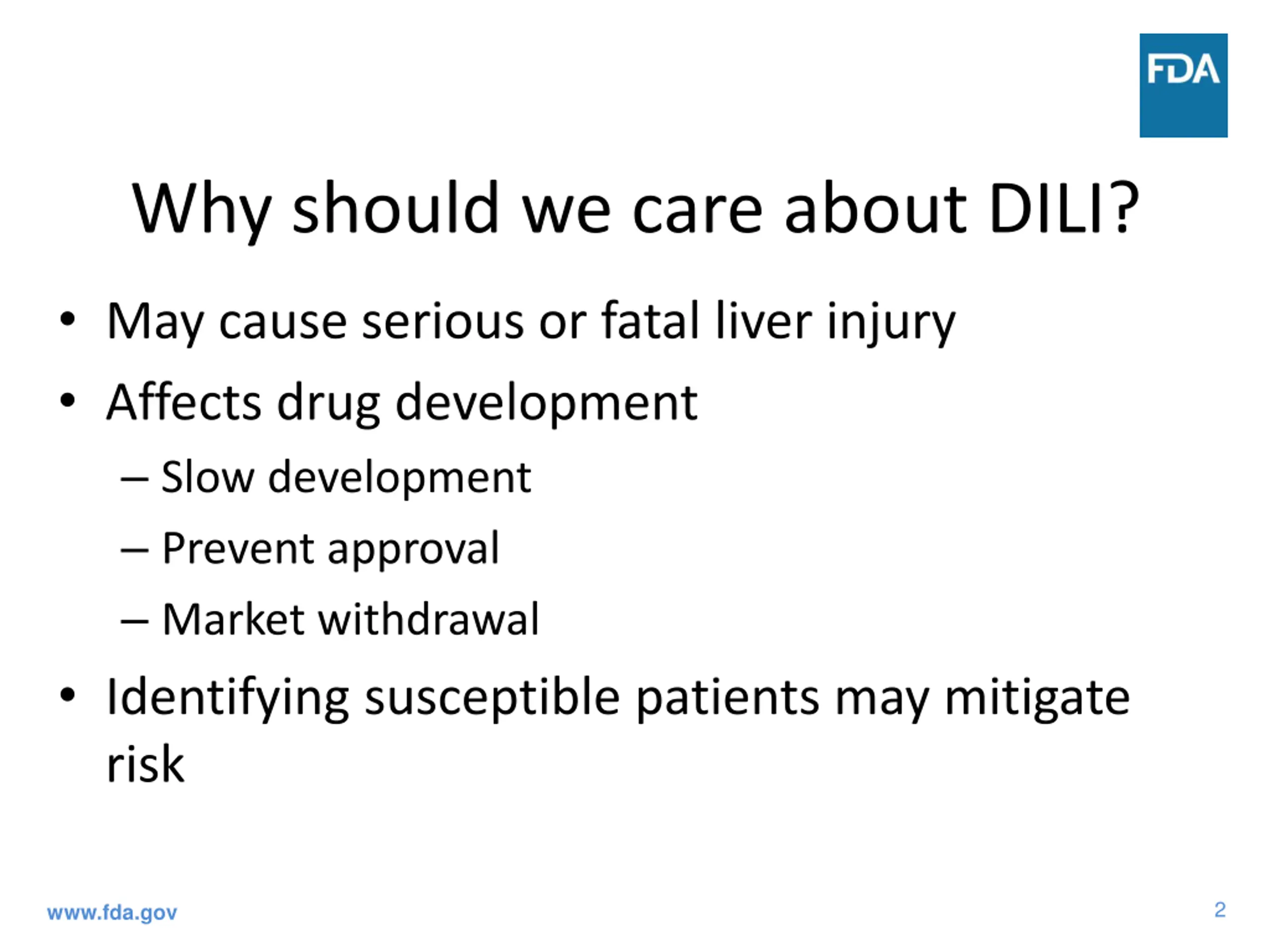 Why should we care about DILI? May cause serious or fatal liver injury Affects drug development Slow development Prevent approval Market withdrawal Identifying susceptible patients may mitigate risk 2 www.fda.gov