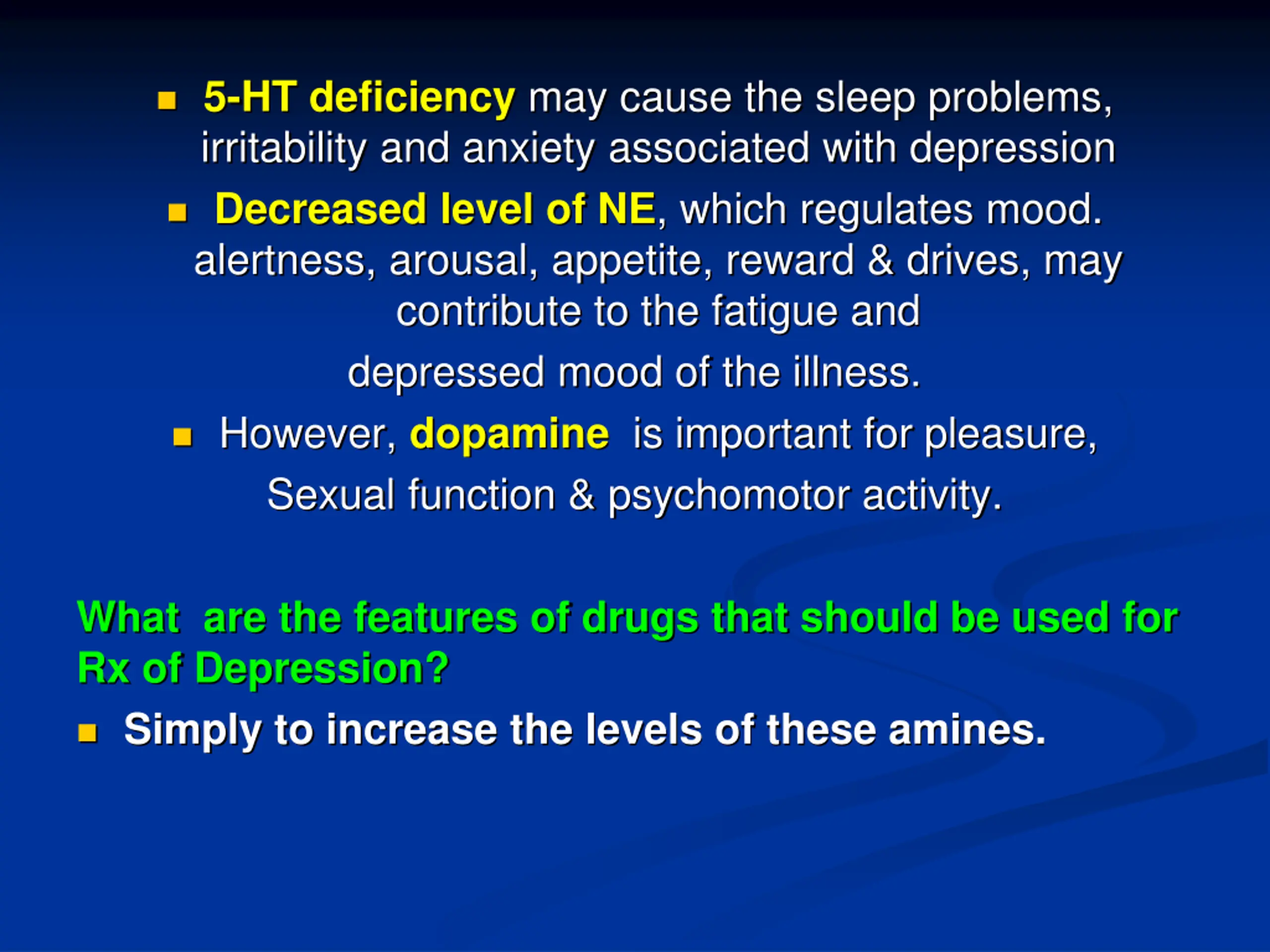 5-HT deficiency may cause the sleep problems, irritability and anxiety associated with depression Decreased level of NE, which regulates mood. alertness, arousal, appetite, reward & drives, may contribute to the fatigue and depressed mood of the illness. However, dopamine is important for pleasure, Sexual function & psychomotor activity. What are the features of drugs that should be used for Rx of Depression? Simply to increase the levels of these amines.