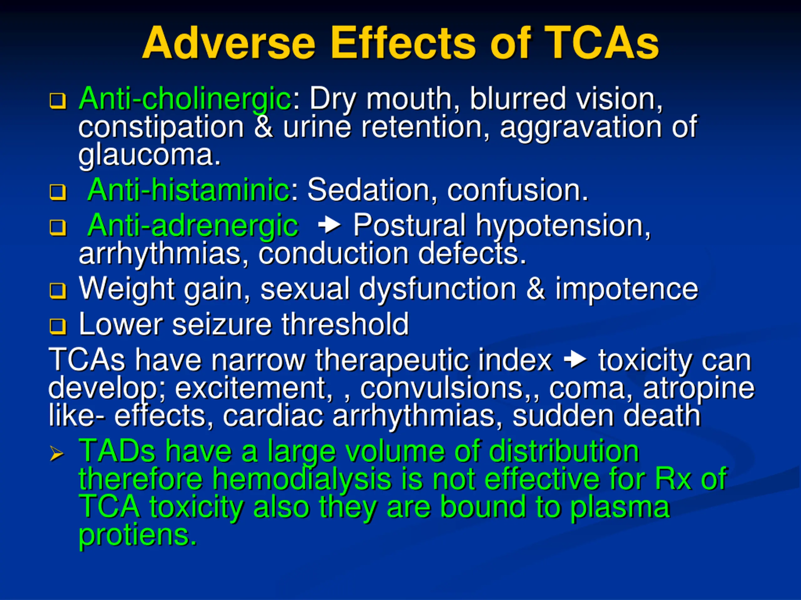 Adverse Effects of TCAs Anti-cholinergic: Dry mouth, blurred vision, constipation & urine retention, aggravation of glaucoma. Anti-histaminic: Sedation, confusion. Anti-adrenergic Postural hypotension, arrhythmias, conduction defects. Weight gain, sexual dysfunction & impotence Lower seizure threshold TCAs have narrow therapeutic index toxicity can develop; excitement, , convulsions,, coma, atropine like- effects, cardiac arrhythmias, sudden death TADs have a large volume of distribution therefore hemodialysis is not effective for Rx of TCA toxicity also they are bound to plasma protiens.