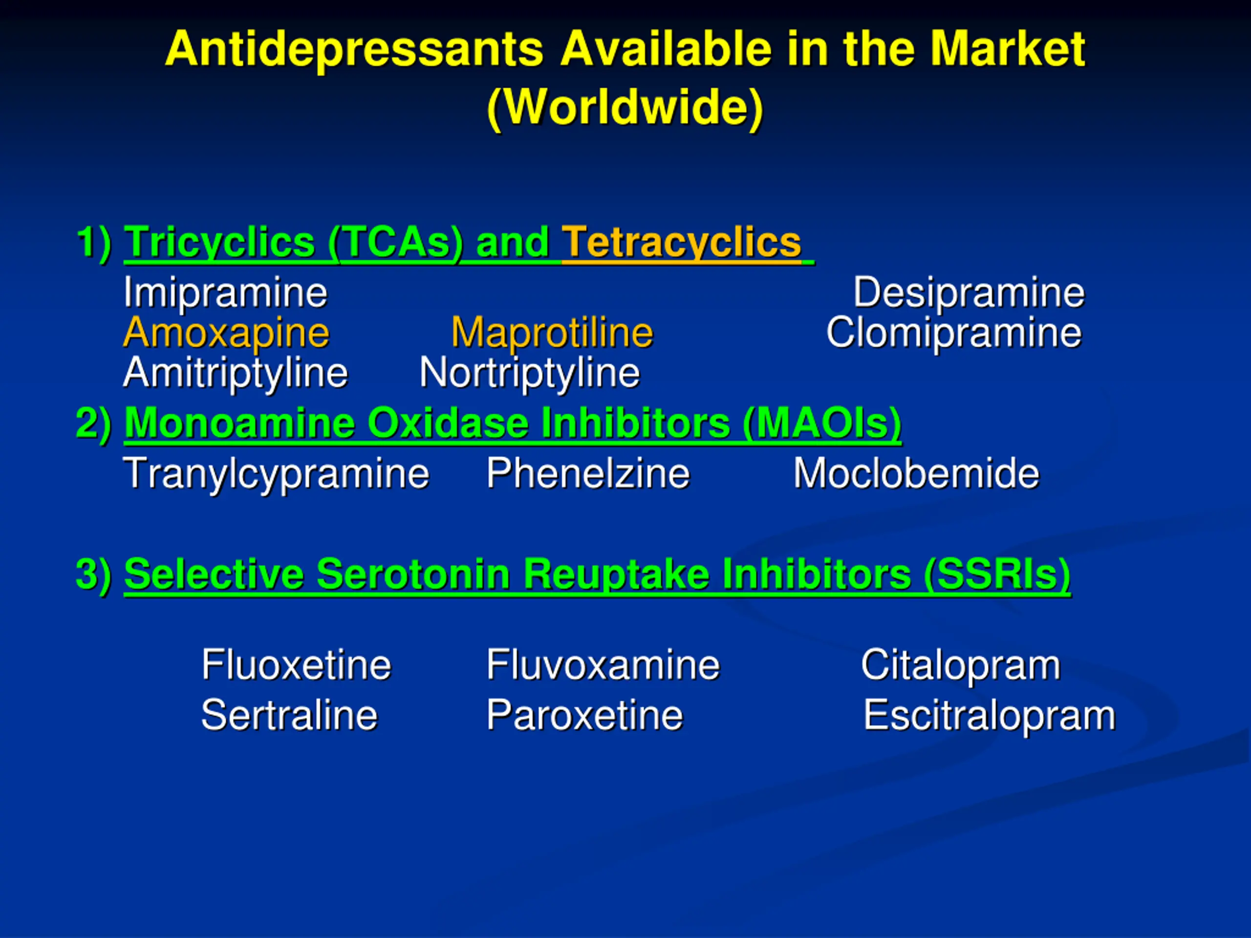 Antidepressants Available in the Market (Worldwide) 1) Tricyclics (TCAs) and Tetracyclics Imipramine Amoxapine Amitriptyline Nortriptyline 2) Monoamine Oxidase Inhibitors (MAOIs) Tranylcypramine Phenelzine Desipramine Clomipramine Maprotiline Moclobemide 3) Selective Serotonin Reuptake Inhibitors (SSRIs) Fluoxetine Sertraline Fluvoxamine Paroxetine Citalopram Escitralopram