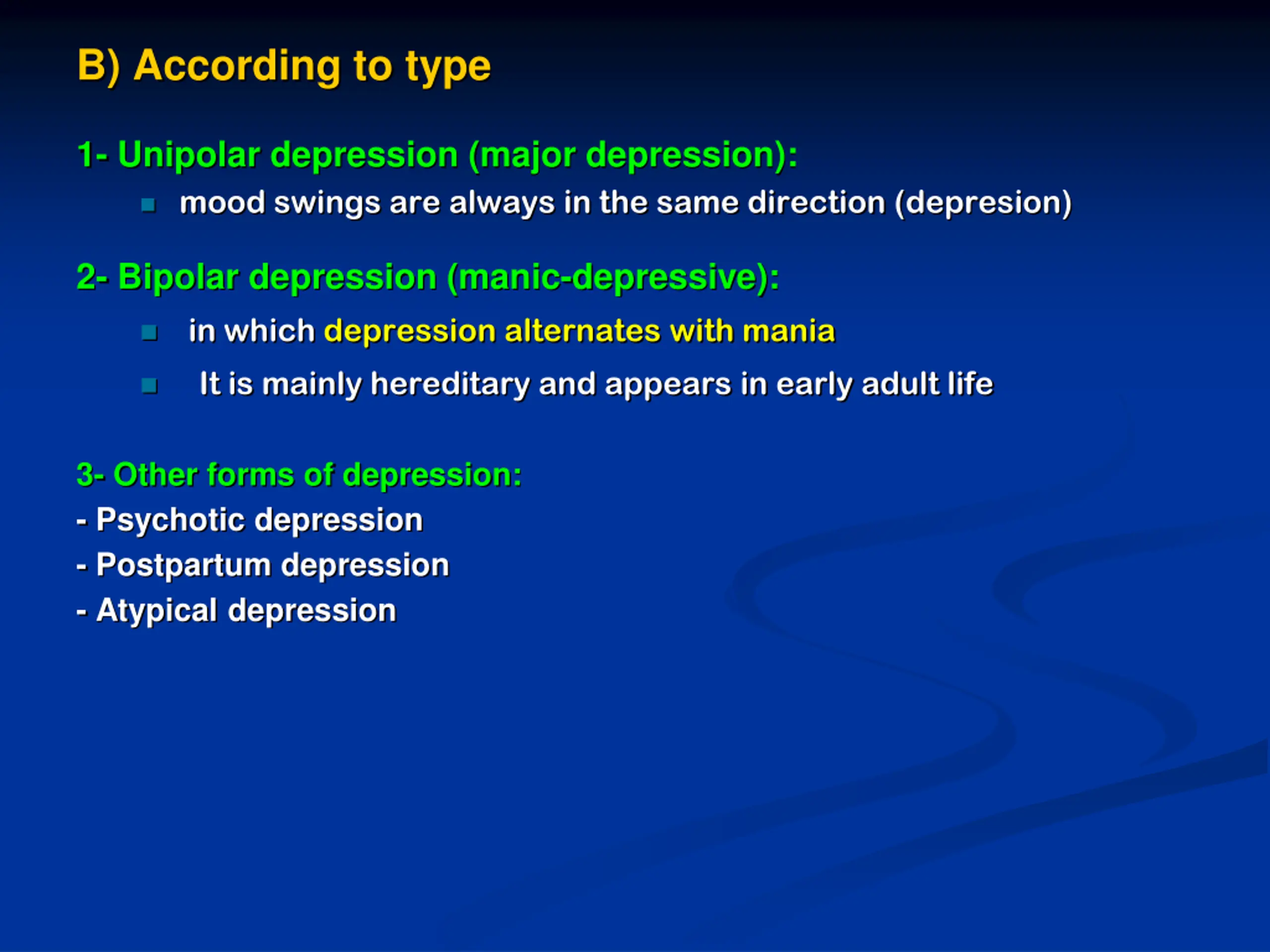 B) According to type 1- Unipolar depression (major depression): mood swings are always in the same direction (depresion) 2- Bipolar depression (manic-depressive): in which depression alternates with mania It is mainly hereditary and appears in early adult life 3- Other forms of depression: - Psychotic depression - Postpartum depression - Atypical depression