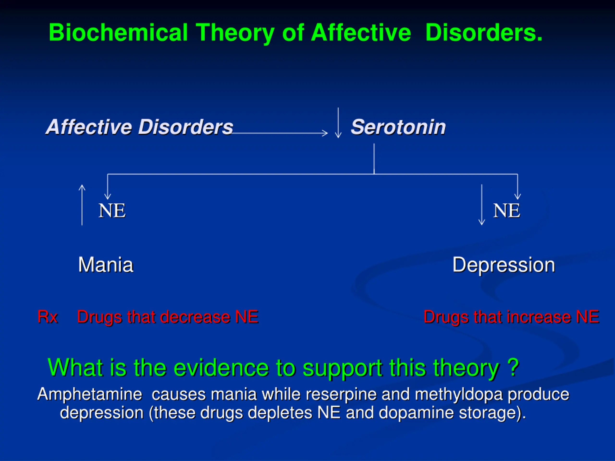 Biochemical Theory of Affective Disorders. Affective Disorders Serotonin NE NE Mania Depression Rx Drugs that decrease NE Drugs that increase NE What is the evidence to support this theory ? Amphetamine causes mania while reserpine and methyldopa produce depression (these drugs depletes NE and dopamine storage).