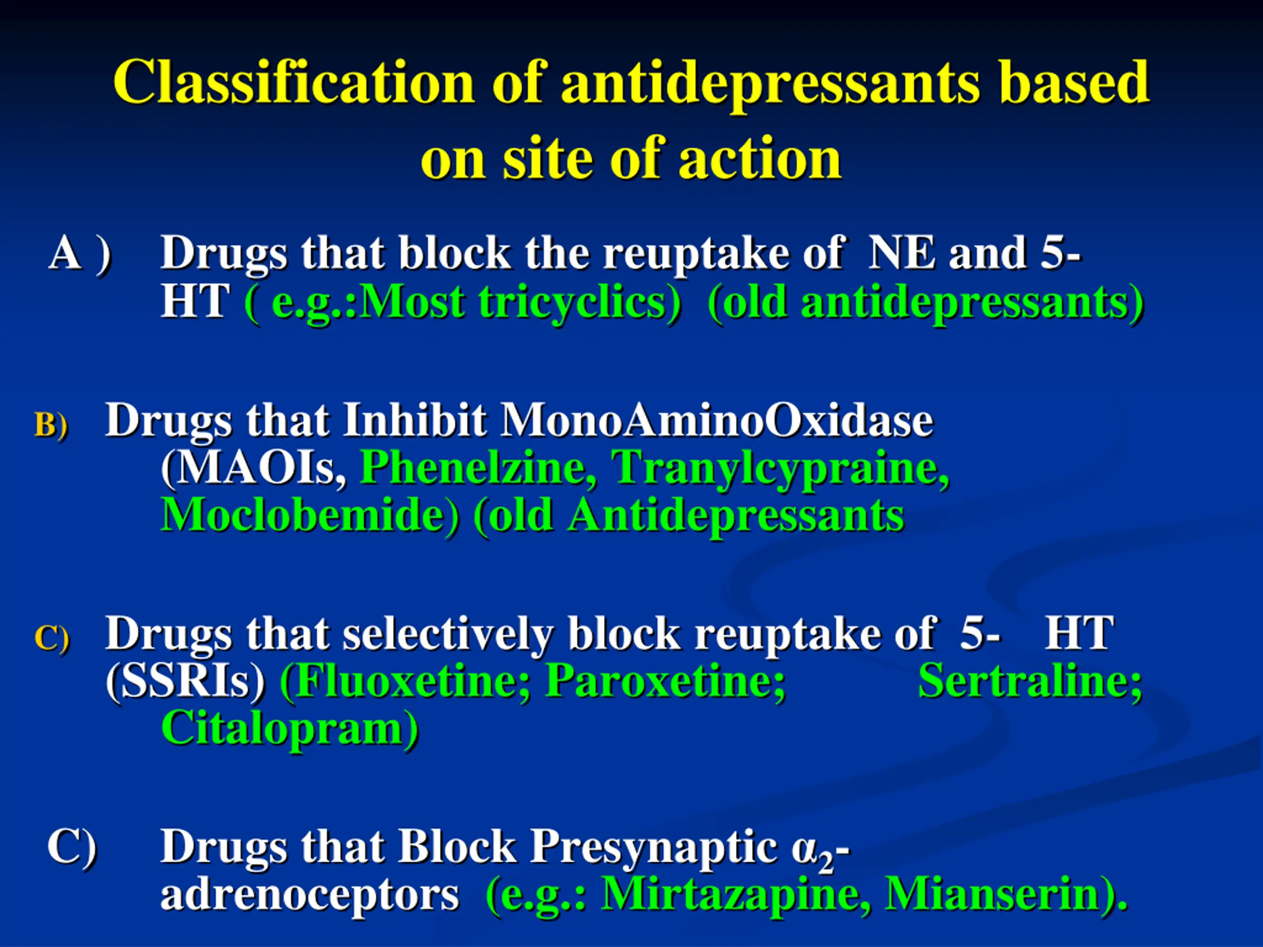 Classification of antidepressants based on site of action A ) Drugs that block the reuptake of NE and 5- HT ( e.g.:Most tricyclics) (old antidepressants) B) Drugs that Inhibit MonoAminoOxidase (MAOIs, Phenelzine, Tranylcypraine, Moclobemide) (old Antidepressants C) Drugs that selectively block reuptake of 5- HT (SSRIs) (Fluoxetine; Paroxetine; Citalopram) Sertraline; C) Drugs that Block Presynaptic 2- adrenoceptors (e.g.: Mirtazapine, Mianserin).