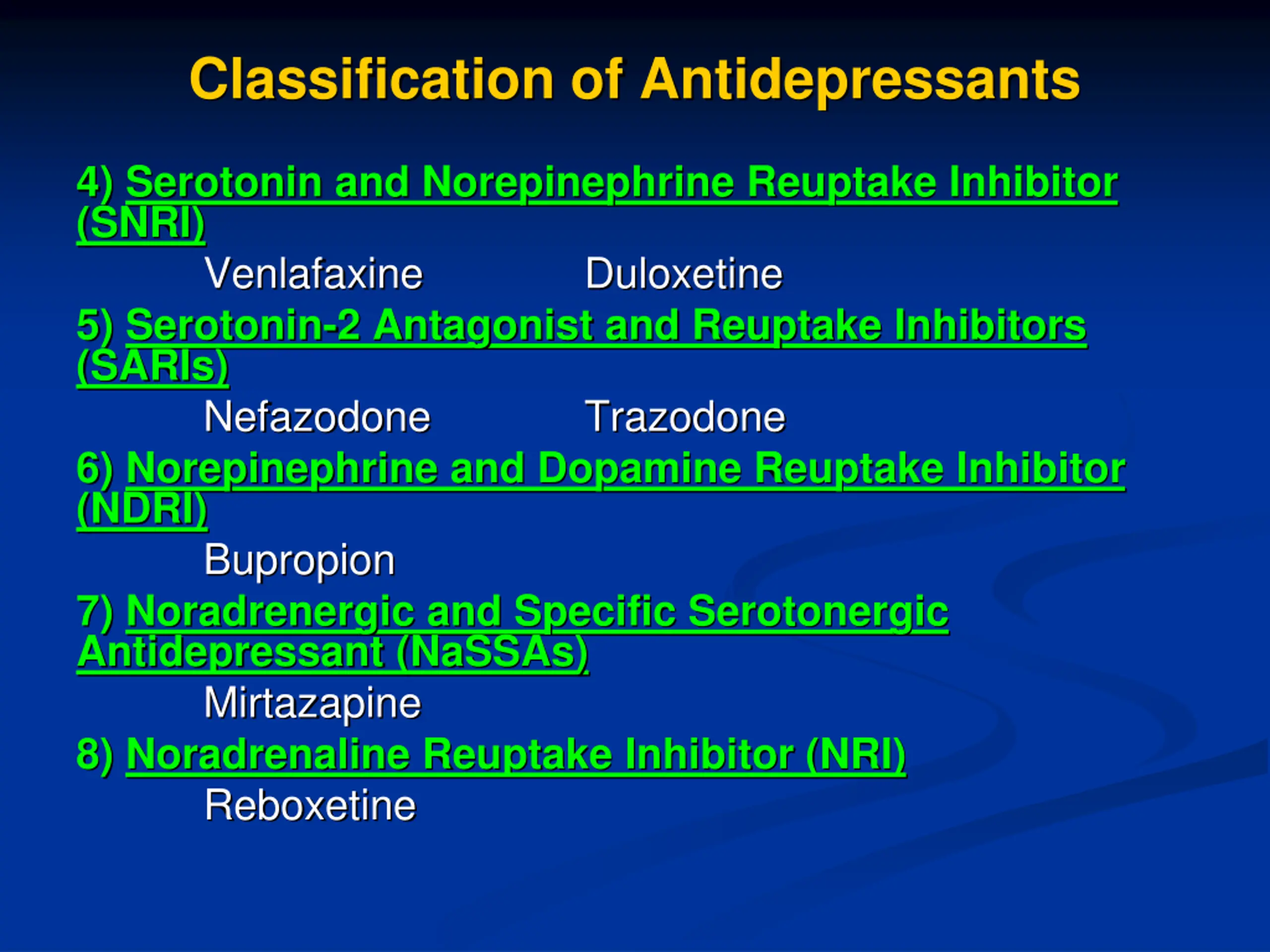 Classification of Antidepressants 4) Serotonin and Norepinephrine Reuptake Inhibitor (SNRI) Venlafaxine Duloxetine 5) Serotonin-2 Antagonist and Reuptake Inhibitors (SARIs) Nefazodone Trazodone 6) Norepinephrine and Dopamine Reuptake Inhibitor (NDRI) Bupropion 7) Noradrenergic and Specific Serotonergic Antidepressant (NaSSAs) Mirtazapine 8) Noradrenaline Reuptake Inhibitor (NRI) Reboxetine