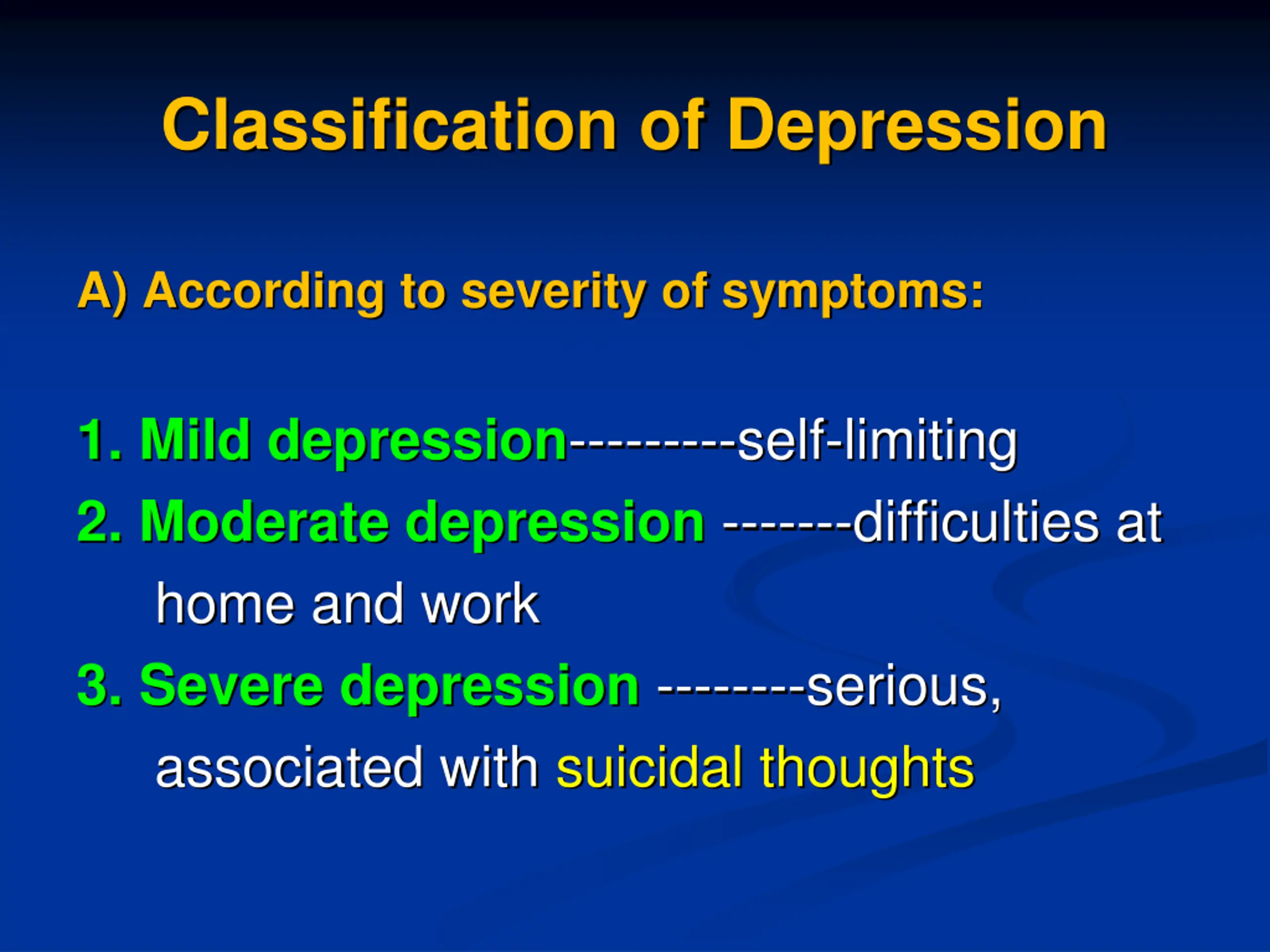 Classification of Depression A) According to severity of symptoms: 1. Mild depression---------self-limiting 2. Moderate depression -------difficulties at home and work 3. Severe depression --------serious, associated with suicidal thoughts