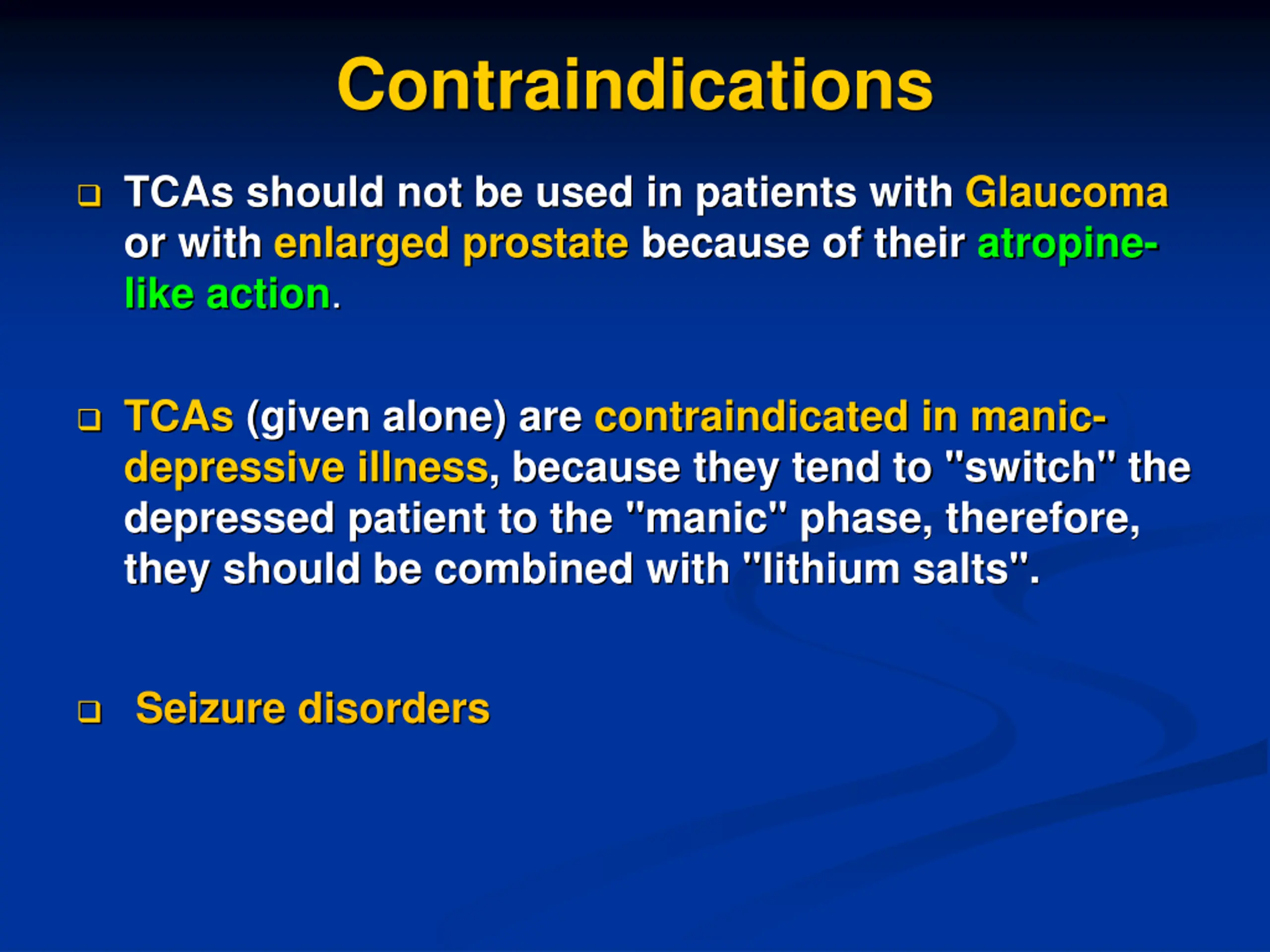 Contraindications TCAs should not be used in patients with Glaucoma or with enlarged prostate because of their atropine- like action. TCAs (given alone) are contraindicated in manic- depressive illness, because they tend to "switch" the depressed patient to the "manic" phase, therefore, they should be combined with "lithium salts". Seizure disorders