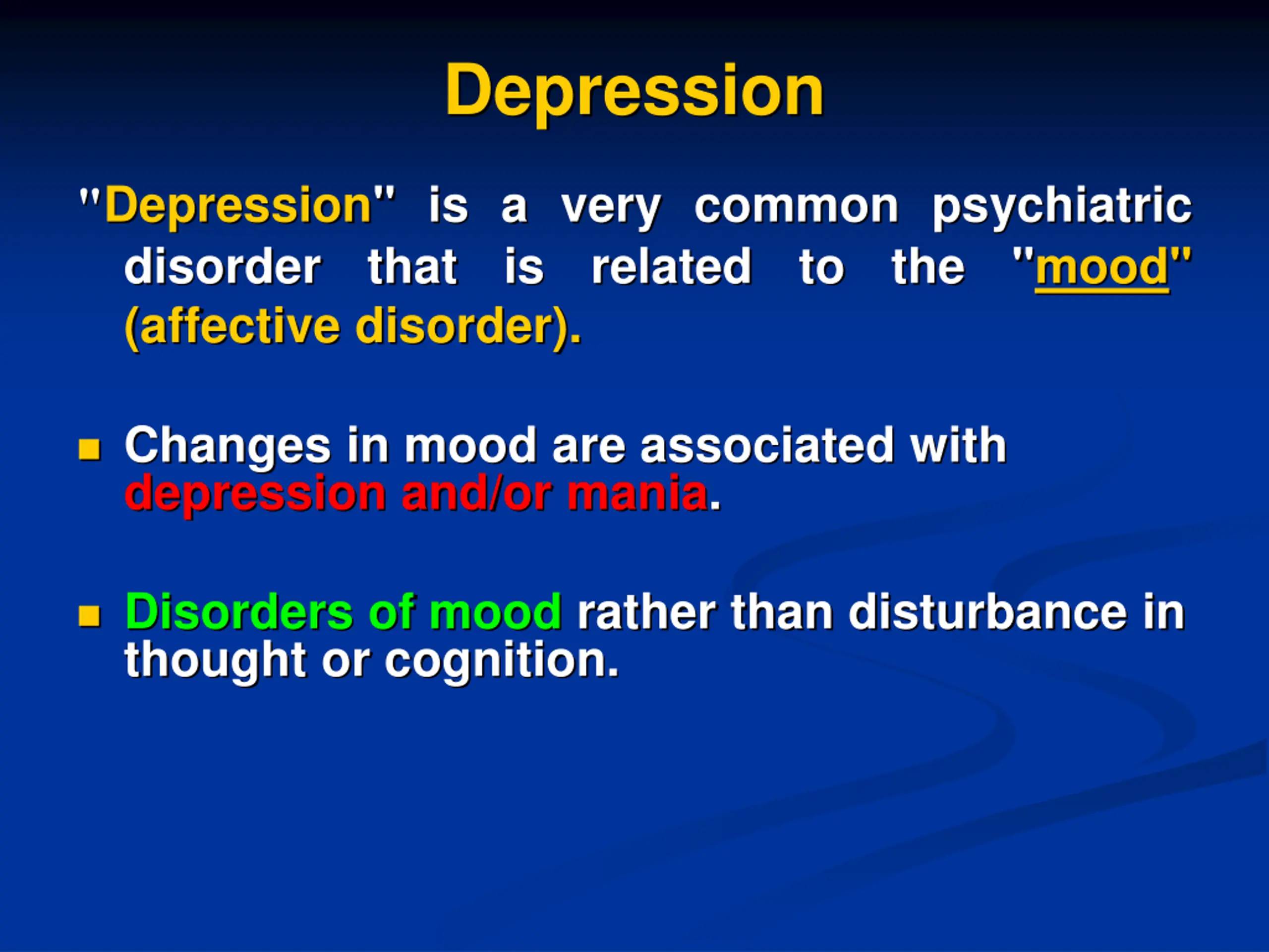 Depression "Depression" is a very common psychiatric disorder that is related (affective disorder). to the "mood" Changes in mood are associated with depression and/or mania. Disorders of mood rather than disturbance in thought or cognition.