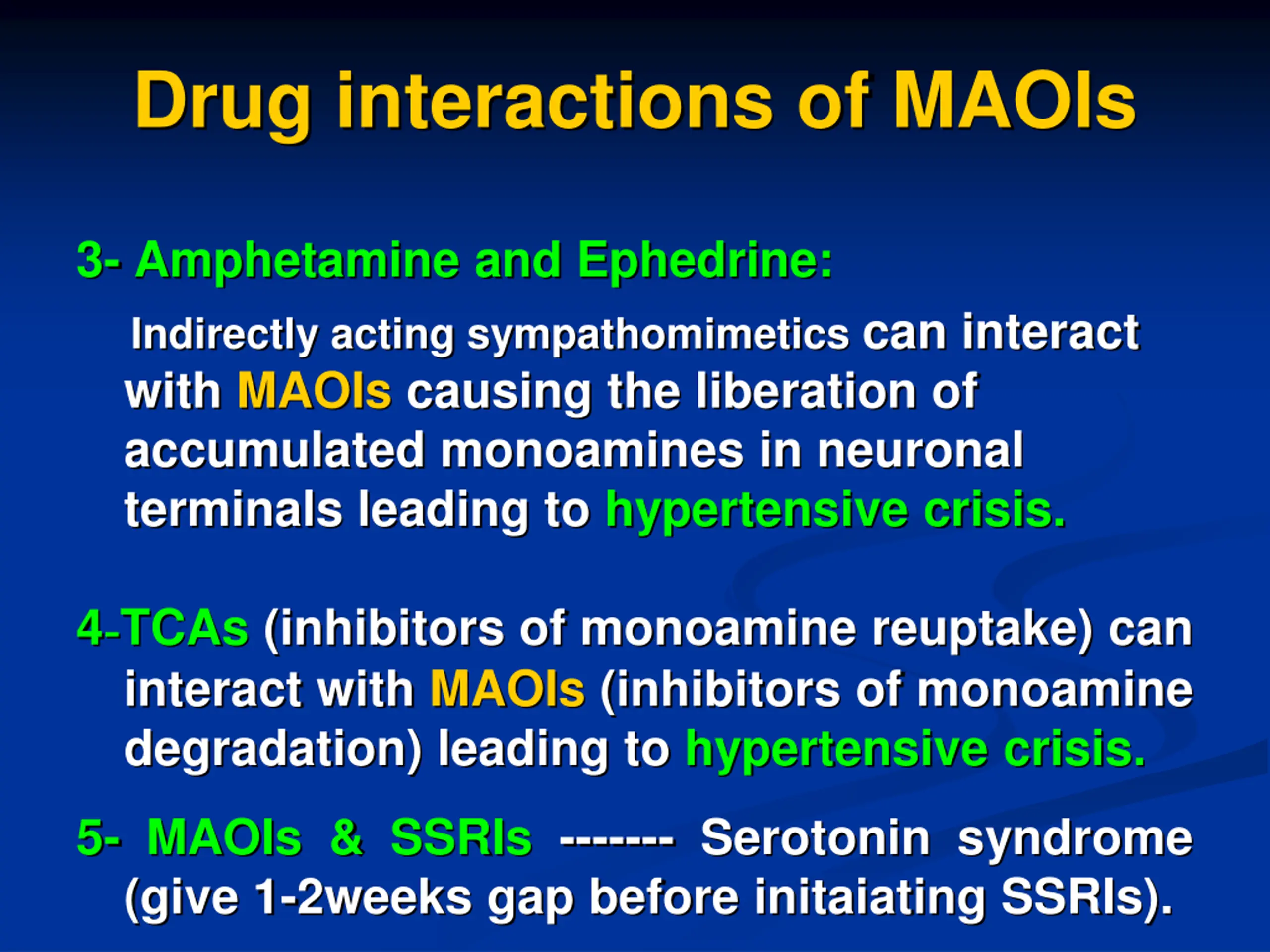 Drug interactions of MAOIs 3- Amphetamine and Ephedrine: Indirectly acting sympathomimetics can interact with MAOIs causing the liberation of accumulated monoamines in neuronal terminals leading to hypertensive crisis. 4-TCAs (inhibitors of monoamine reuptake) can interact with MAOIs (inhibitors of monoamine degradation) leading to hypertensive crisis. 5- MAOIs & SSRIs ------- Serotonin syndrome (give 1-2weeks gap before initaiating SSRIs).