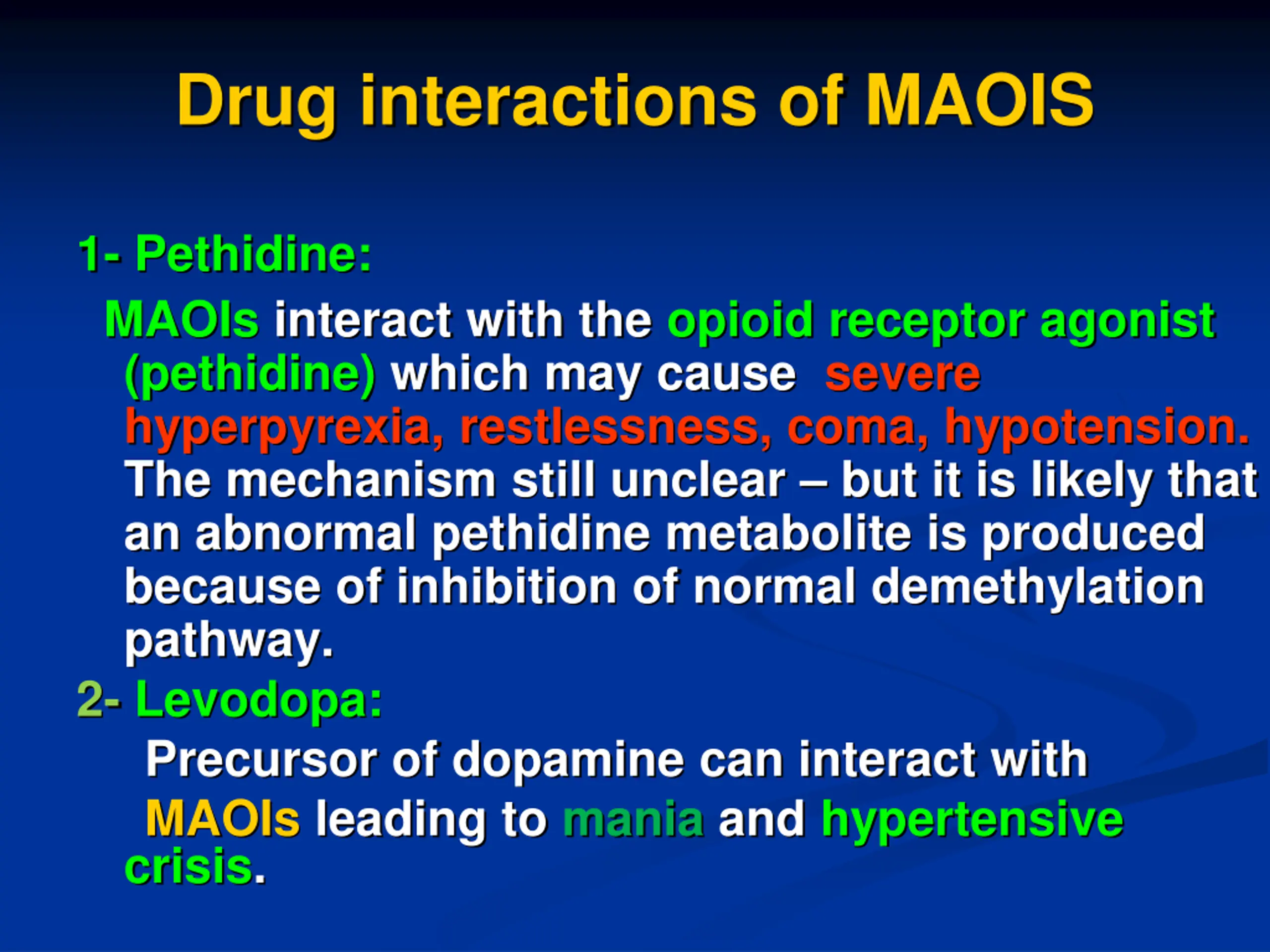 Drug interactions of MAOIS 1- Pethidine: MAOIs interact with the opioid receptor agonist (pethidine) which may cause severe hyperpyrexia, restlessness, coma, hypotension. The mechanism still unclear but it is likely that an abnormal pethidine metabolite is produced because of inhibition of normal demethylation pathway. 2- Levodopa: Precursor of dopamine can interact with MAOIs leading to mania and hypertensive crisis.
