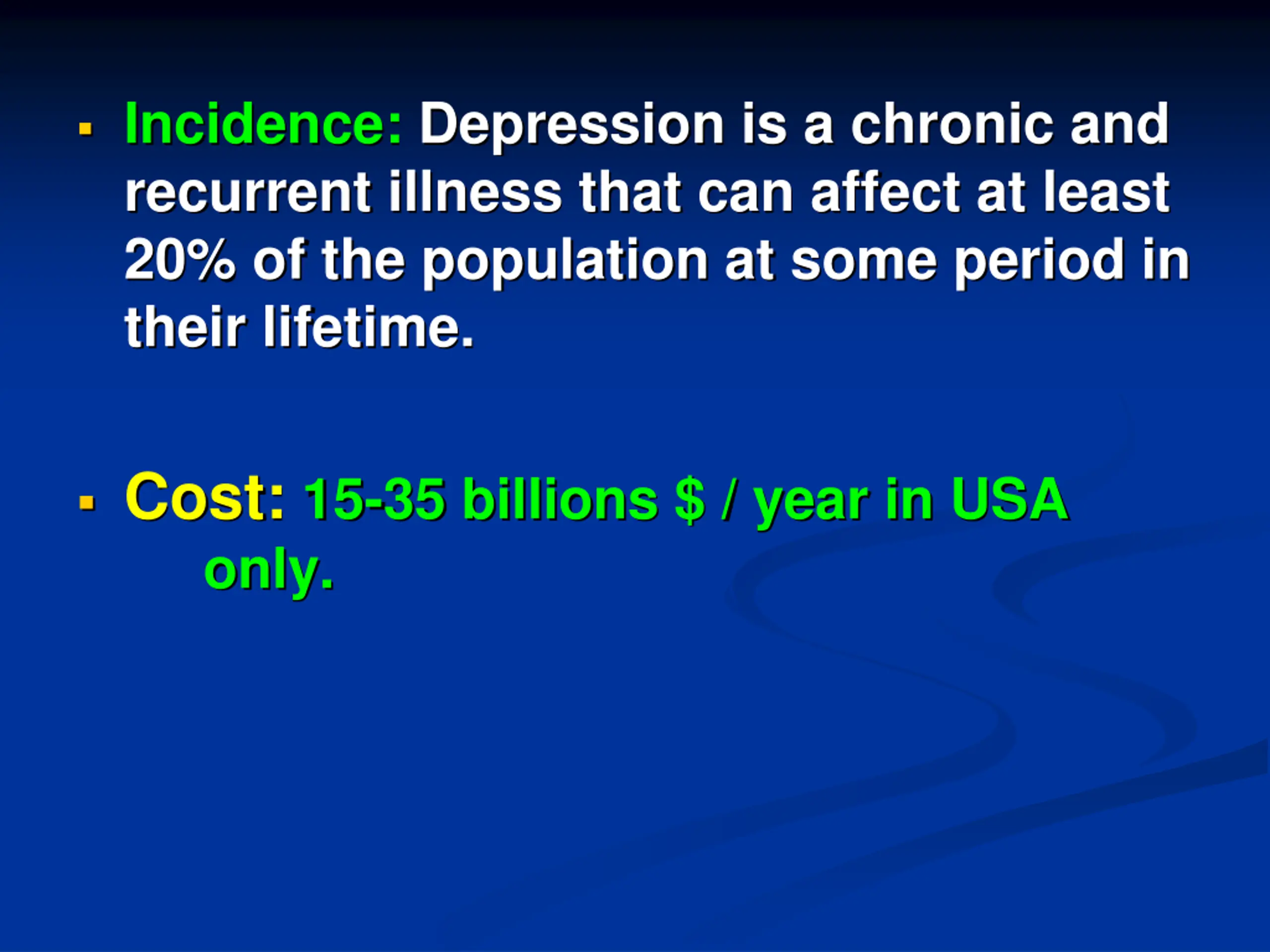 Incidence: Depression is a chronic and recurrent illness that can affect at least 20% of the population at some period in their lifetime. Cost: 15-35 billions $ / year in USA only.