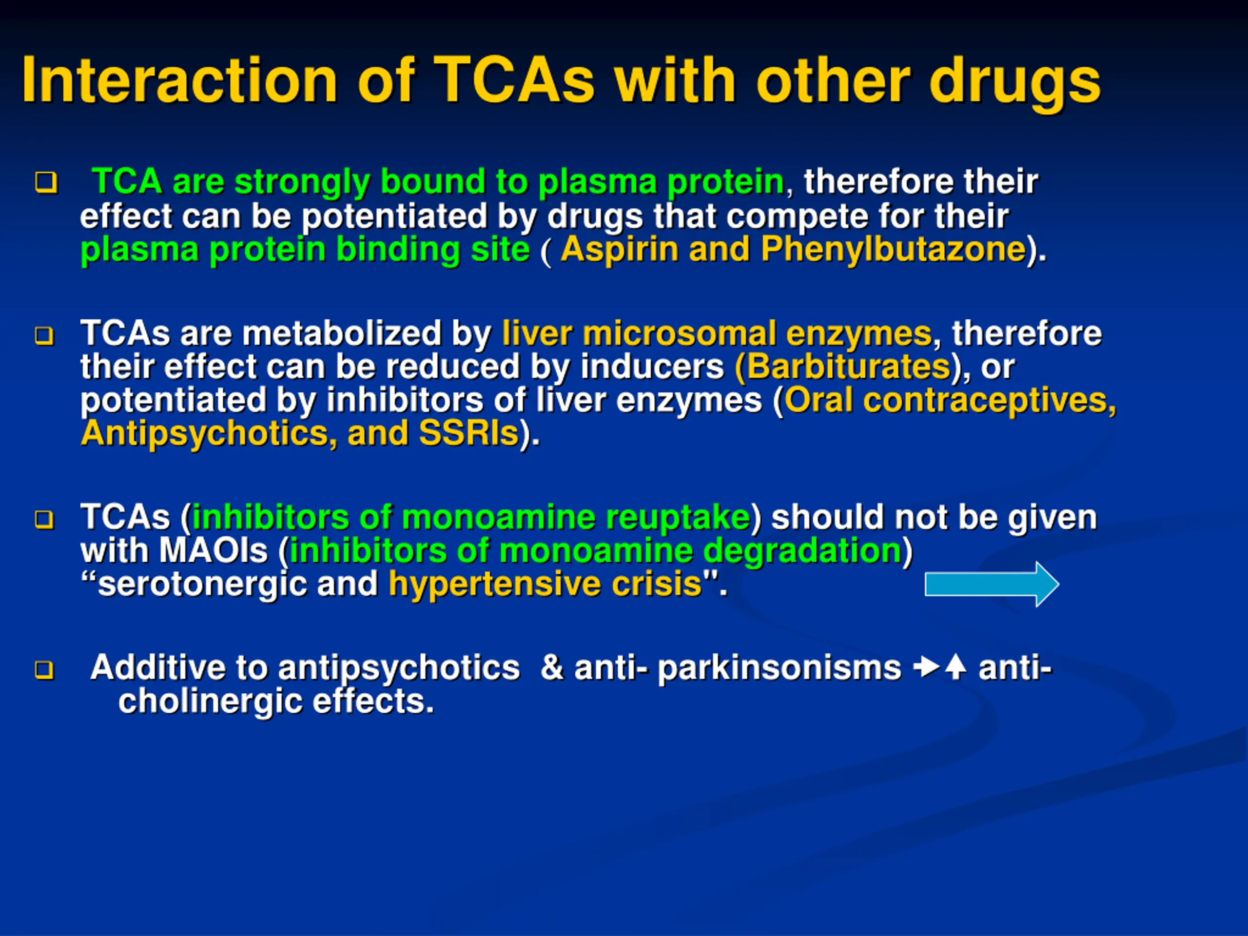 Interaction of TCAs with other drugs TCA are strongly bound to plasma protein, therefore their effect can be potentiated by drugs that compete for their plasma protein binding site ( Aspirin and Phenylbutazone). TCAs are metabolized by liver microsomal enzymes, therefore their effect can be reduced by inducers (Barbiturates), or potentiated by inhibitors of liver enzymes (Oral contraceptives, Antipsychotics, and SSRIs). TCAs (inhibitors of monoamine reuptake) should not be given with MAOIs (inhibitors of monoamine degradation) serotonergic and hypertensive crisis". Additive to antipsychotics & anti- parkinsonisms cholinergic effects. anti-