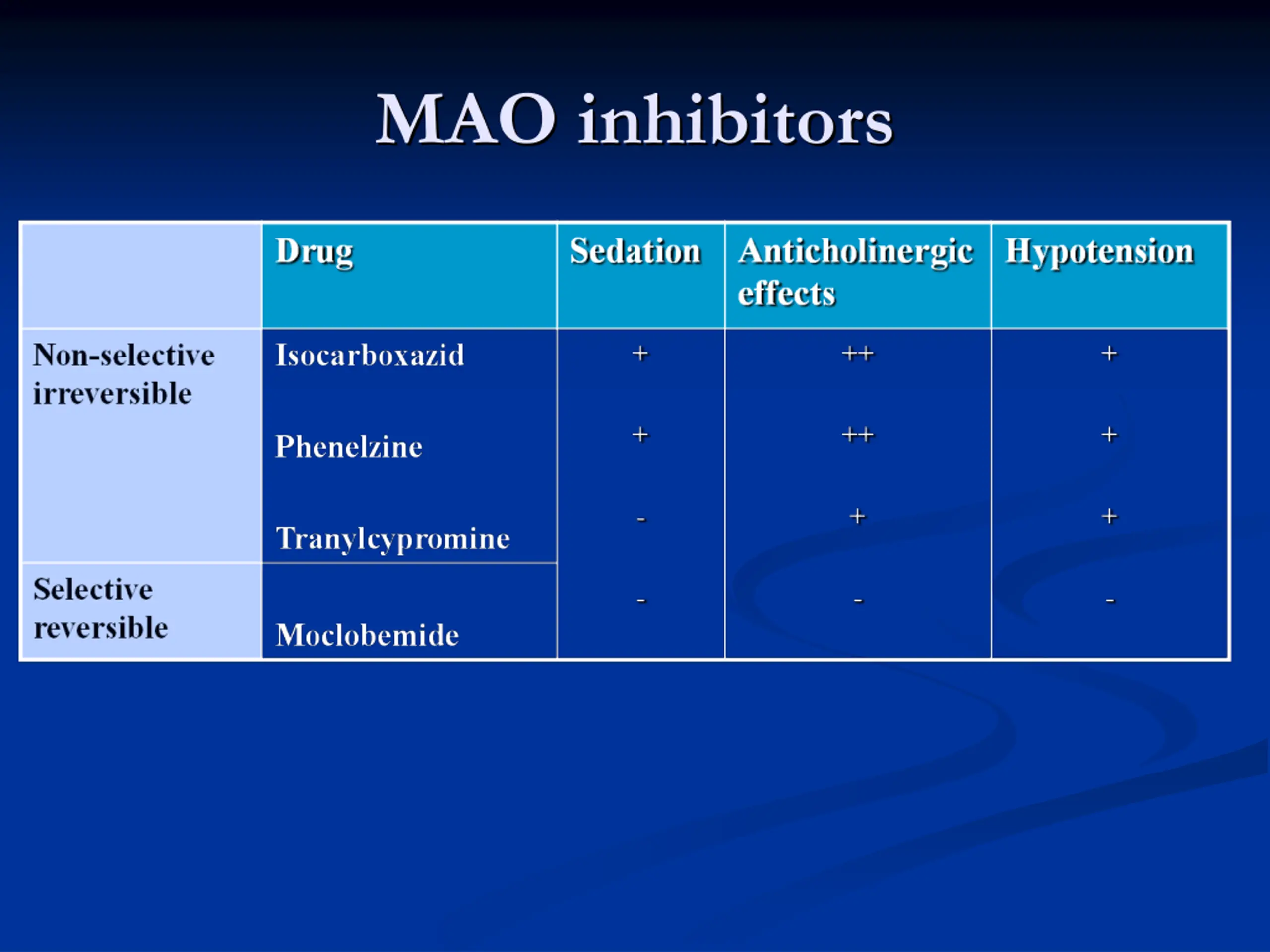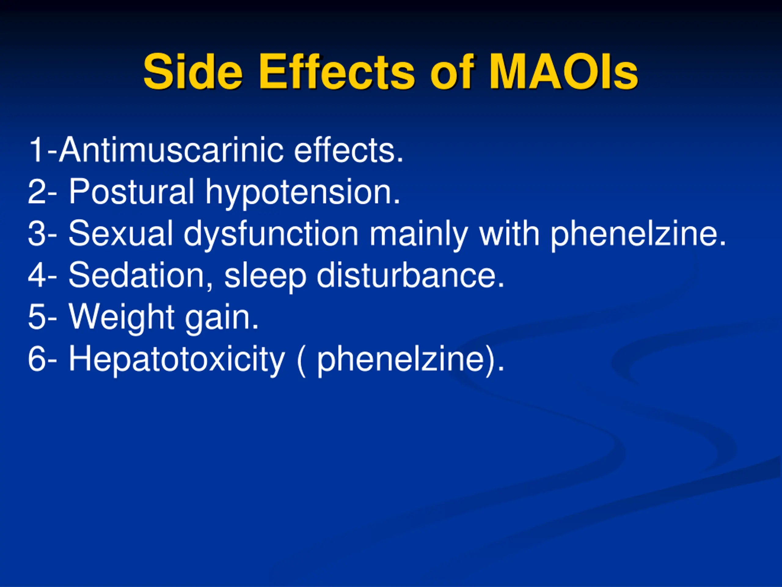 Side Effects of MAOIs 1-Antimuscarinic effects. 2- Postural hypotension. 3- Sexual dysfunction mainly with phenelzine. 4- Sedation, sleep disturbance. 5- Weight gain. 6- Hepatotoxicity ( phenelzine).