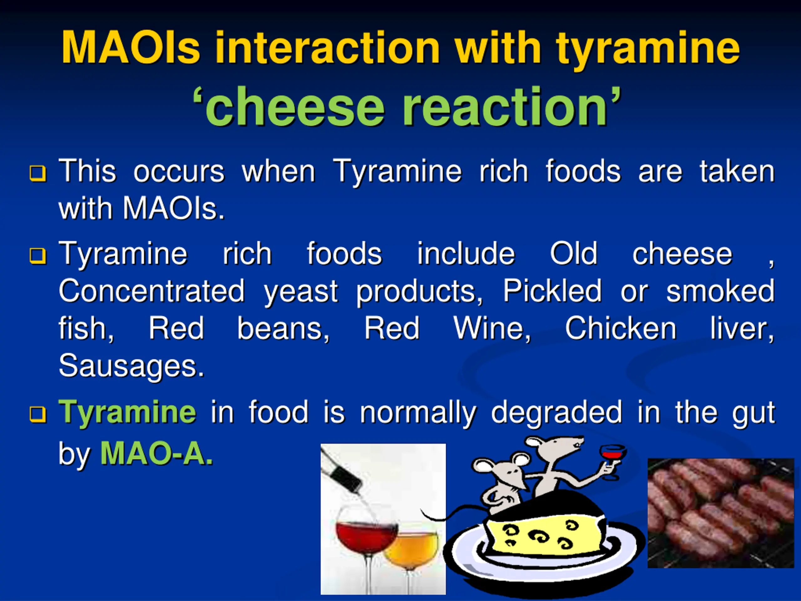 MAOIs interaction with tyramine cheese reaction This occurs when Tyramine rich foods are taken with MAOIs. Tyramine rich foods Concentrated yeast products, Pickled or smoked fish, Red beans, Red Sausages. Tyramine in food is normally degraded in the gut by MAO-A. include Old cheese , Wine, Chicken liver, mouse