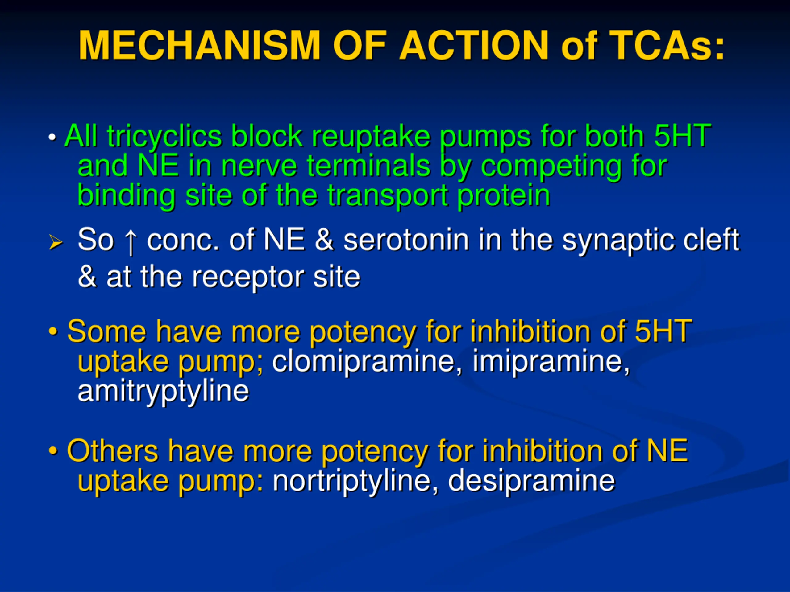 MECHANISM OF ACTION of TCAs: All tricyclics block reuptake pumps for both 5HT and NE in nerve terminals by competing for binding site of the transport protein So conc. of NE & serotonin in the synaptic cleft & at the receptor site Some have more potency for inhibition of 5HT uptake pump; clomipramine, imipramine, amitryptyline Others have more potency for inhibition of NE uptake pump: nortriptyline, desipramine