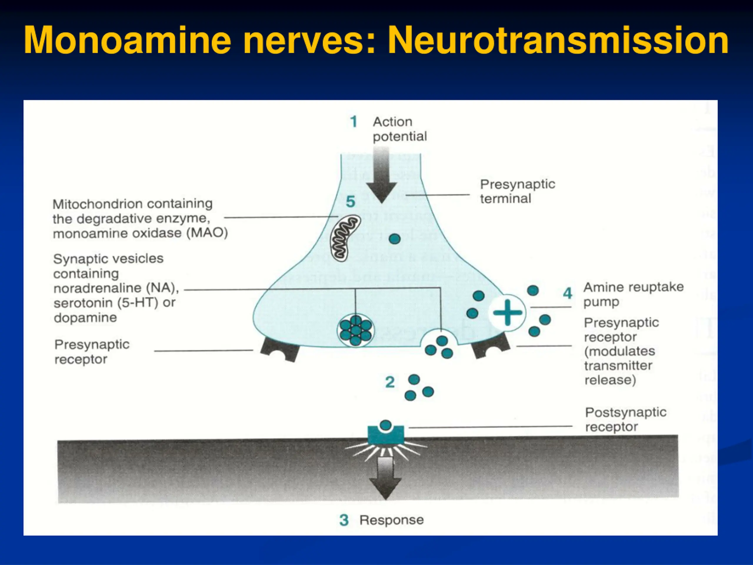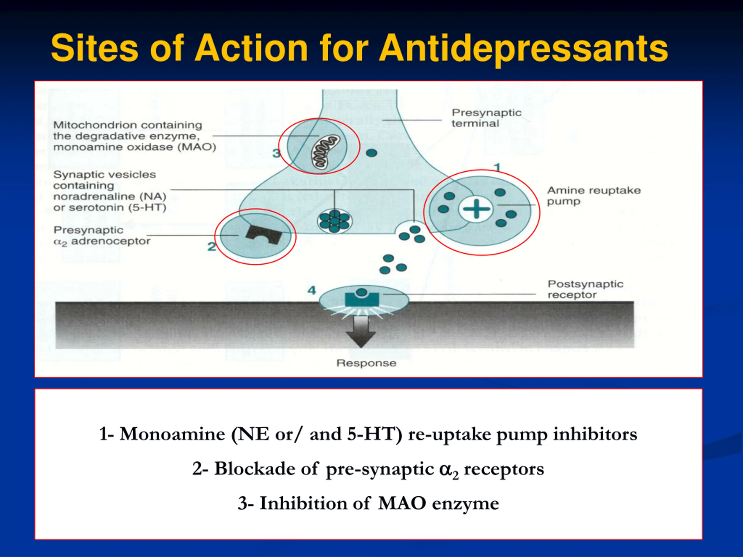 Sites of Action for Antidepressants 1- Monoamine (NE or/ and 5-HT) re-uptake pump inhibitors 2- Blockade of pre-synaptic 2receptors 3- Inhibition of MAO enzyme
