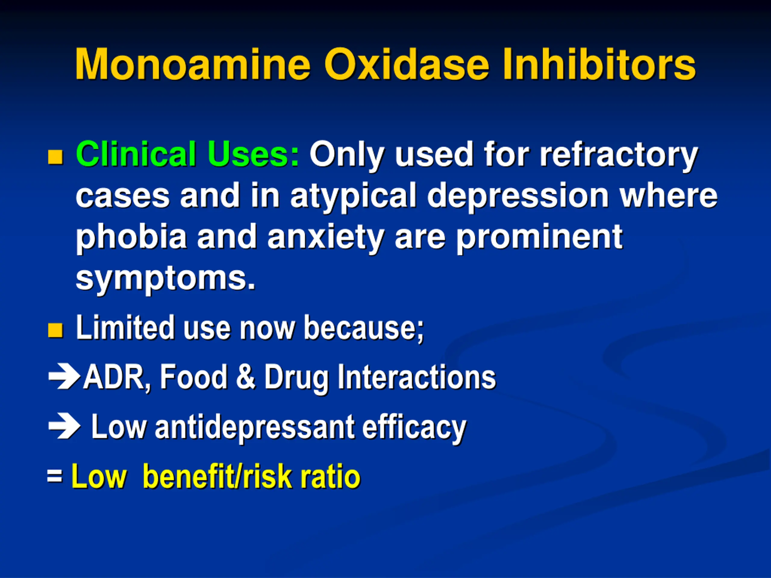 Monoamine Oxidase Inhibitors Clinical Uses: Only used for refractory cases and in atypical depression where phobia and anxiety are prominent symptoms. Limited use now because; ADR, Food & Drug Interactions Low antidepressant efficacy = Low benefit/risk ratio