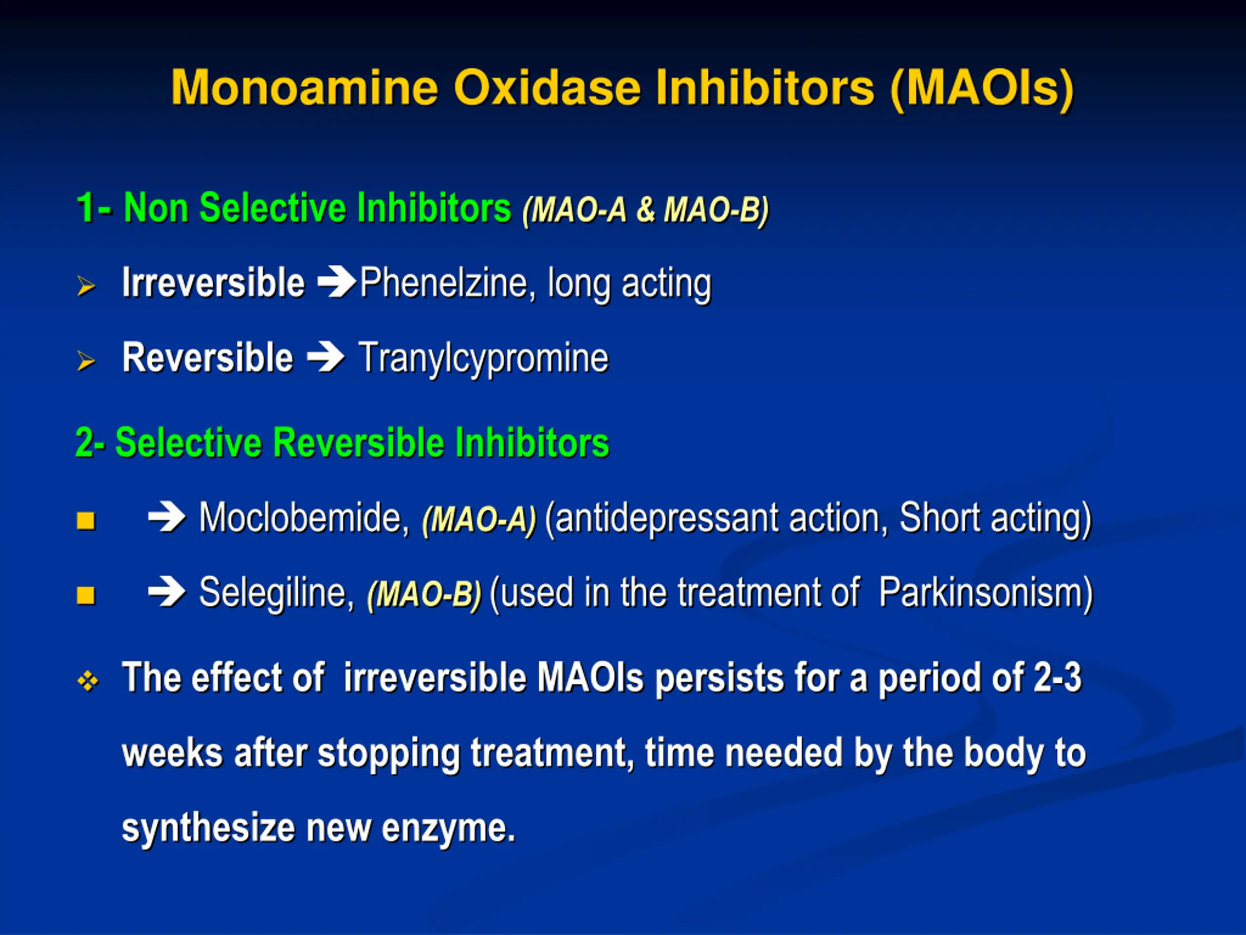 Monoamine Oxidase Inhibitors (MAOIs) 1- Non Selective Inhibitors (MAO-A & MAO-B) Irreversible Phenelzine, long acting Reversible Tranylcypromine 2- Selective Reversible Inhibitors Moclobemide, (MAO-A) (antidepressant action, Short acting) Selegiline, (MAO-B) (used in the treatment of Parkinsonism) The effect of irreversible MAOIs persists for a period of 2-3 weeks after stopping treatment, time needed by the body to synthesize new enzyme.
