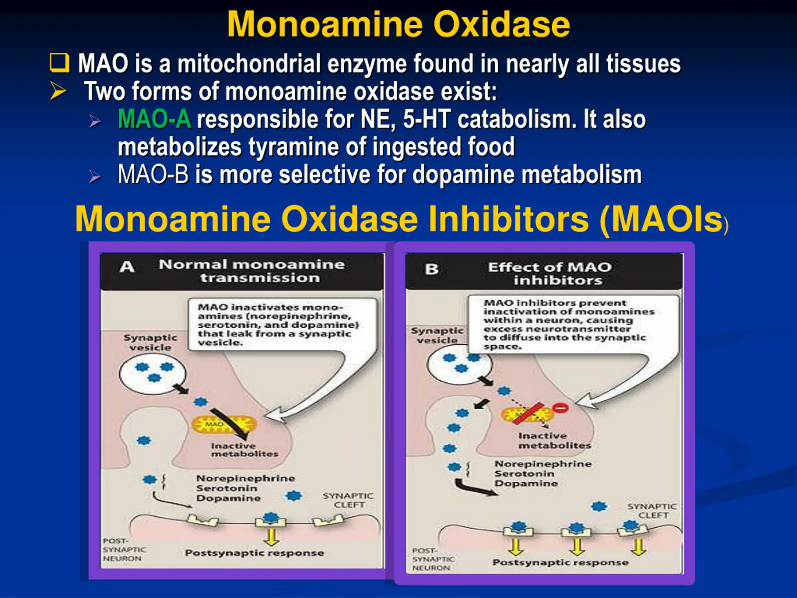 Monoamine Oxidase MAO is a mitochondrial enzyme found in nearly all tissues Two forms of monoamine oxidase exist: MAO-Aresponsible for NE, 5-HT catabolism. It also metabolizes tyramine of ingested food MAO-B is more selective for dopamine metabolism Monoamine Oxidase Inhibitors (MAOIs)