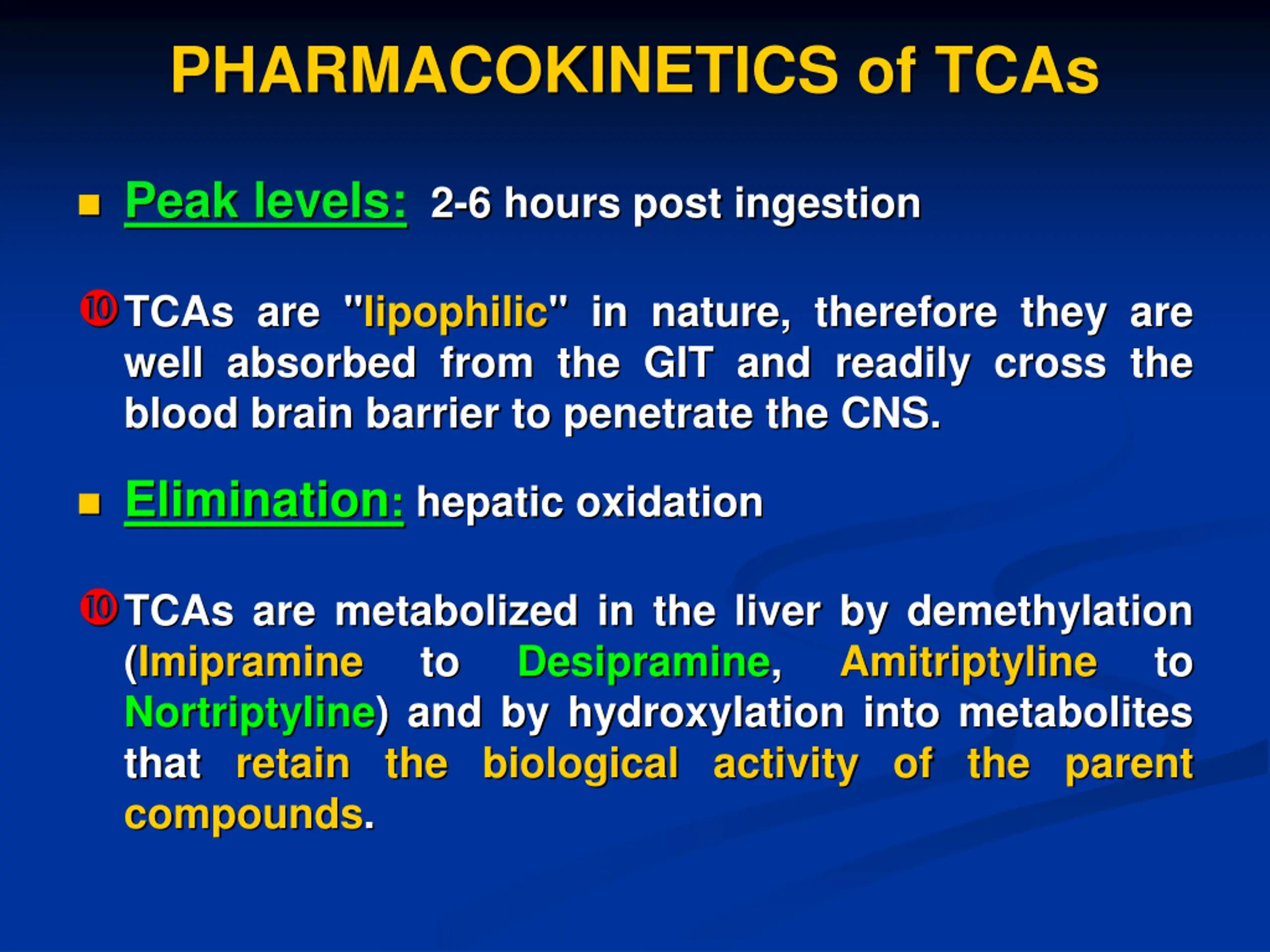 PHARMACOKINETICS of TCAs Peak levels: 2-6 hours post ingestion TCAs are "lipophilic" in nature, therefore they are well absorbed from the GIT and readily cross the blood brain barrier to penetrate the CNS. Elimination: hepatic oxidation TCAs are metabolized in the liver by demethylation (Imipramine to Desipramine, Nortriptyline) and by hydroxylation into metabolites that retain the biological activity of the parent compounds. Amitriptyline to