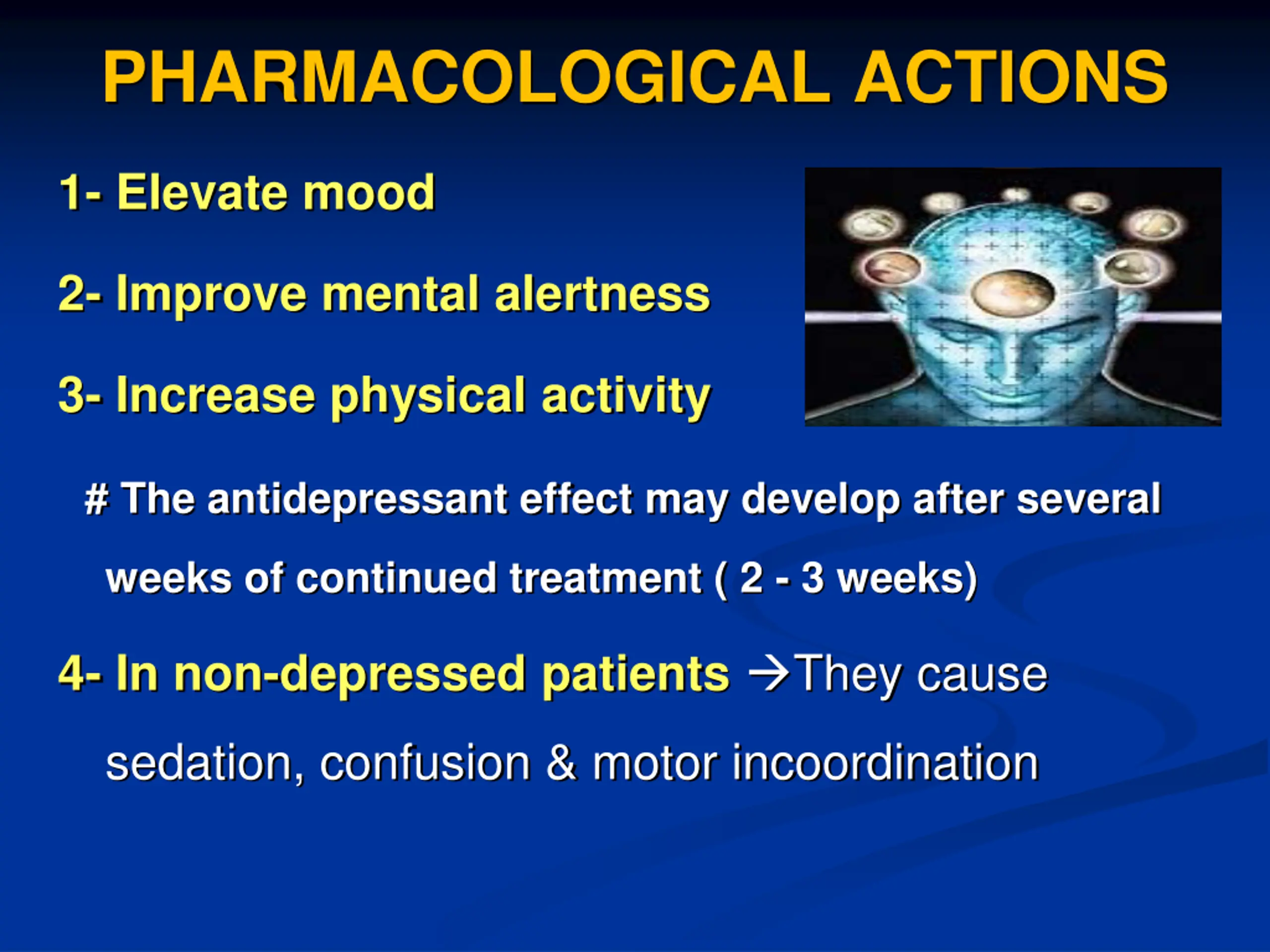 PHARMACOLOGICAL ACTIONS 1- Elevate mood 2- Improve mental alertness 3- Increase physical activity # The antidepressant effect may develop after several weeks of continued treatment ( 2 - 3 weeks) 4- In non-depressed patients They cause sedation, confusion & motor incoordination