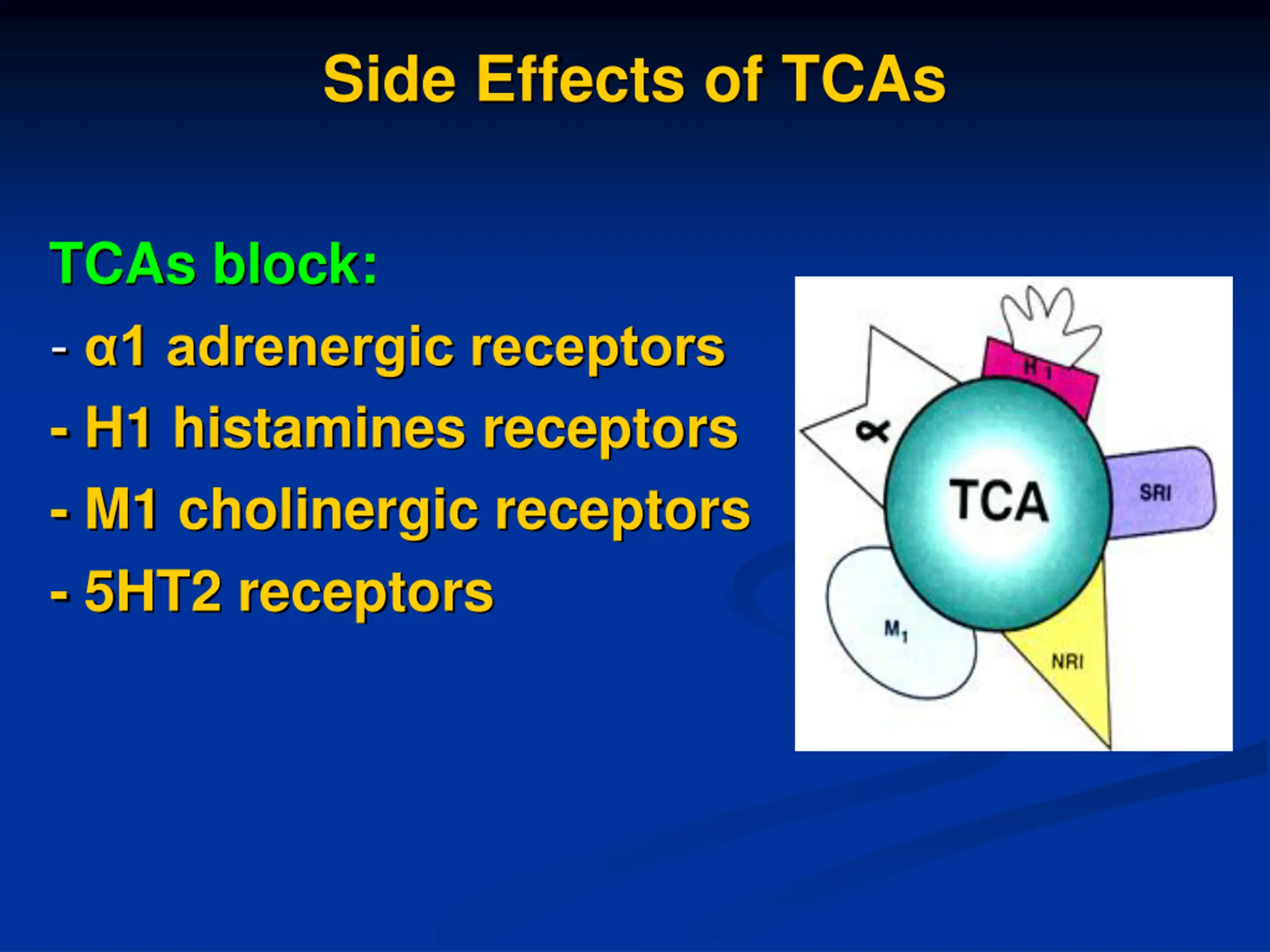 Side Effects of TCAs TCAs block: - 1 adrenergic receptors - H1 histamines receptors - M1 cholinergic receptors - 5HT2 receptors