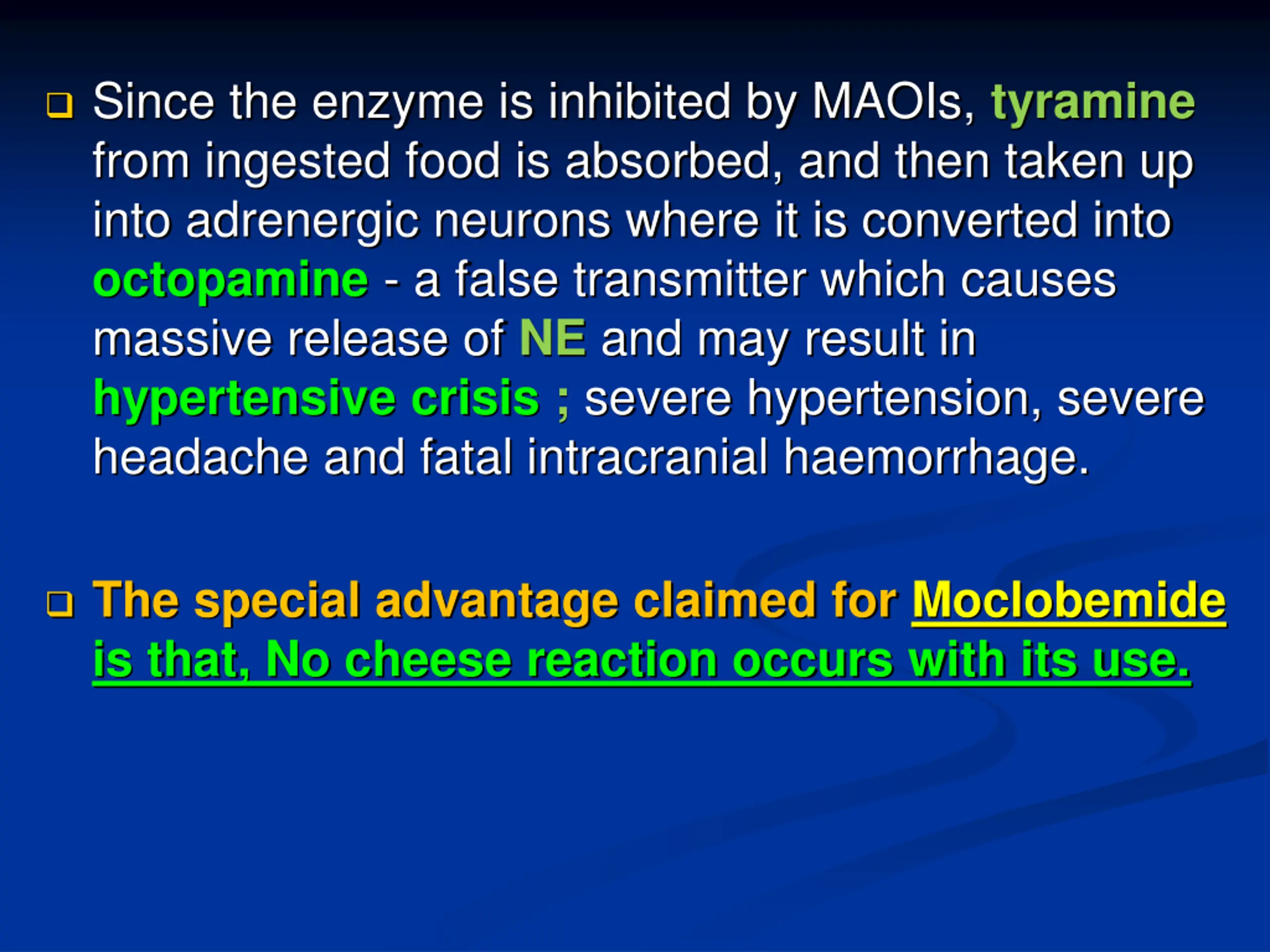 Since the enzyme is inhibited by MAOIs, tyramine from ingested food is absorbed, and then taken up into adrenergic neurons where it is converted into octopamine - a false transmitter which causes massive release of NE and may result in hypertensive crisis ; severe hypertension, severe headache and fatal intracranial haemorrhage. The special advantage claimed for Moclobemide is that, No cheese reaction occurs with its use.