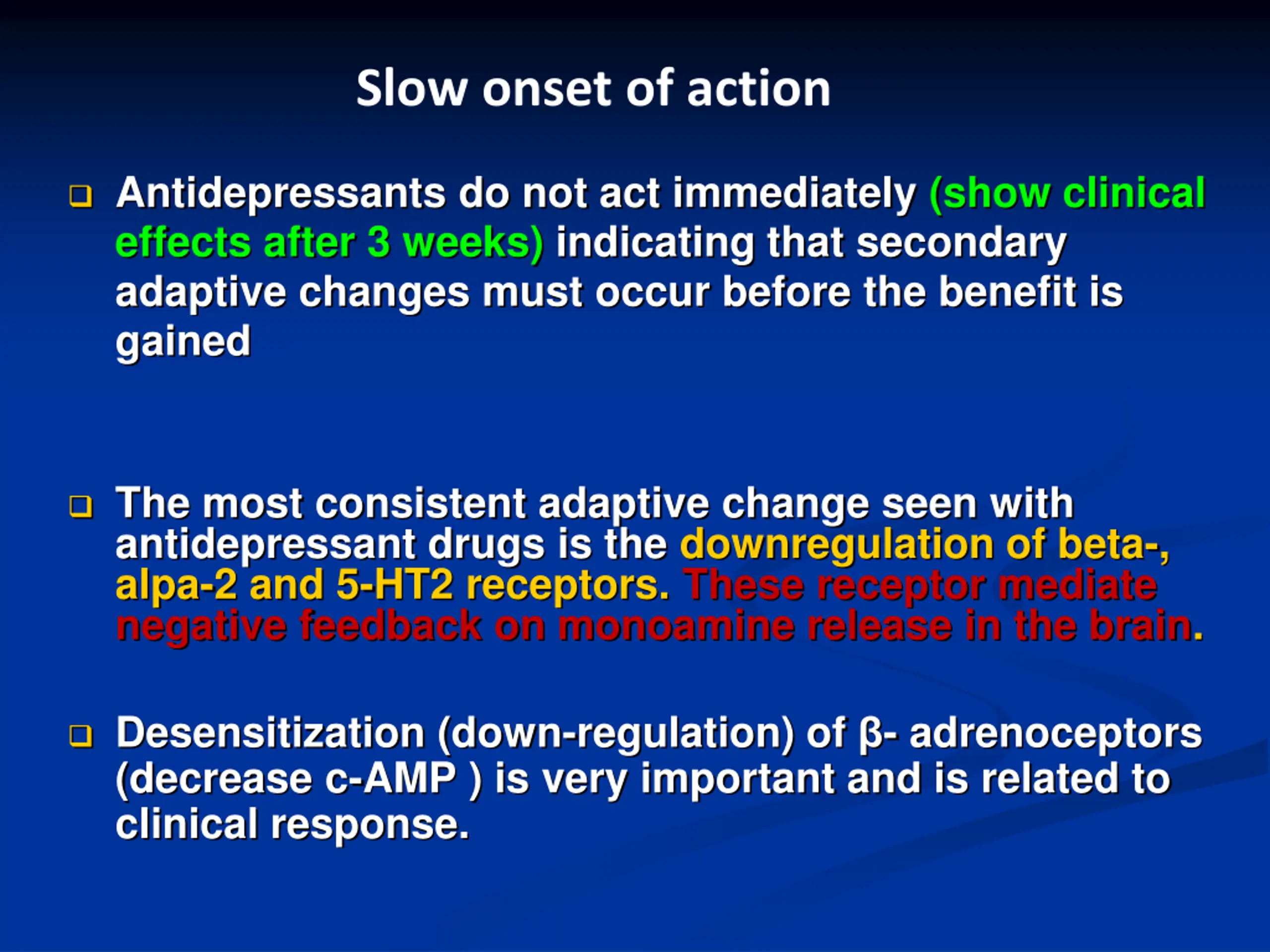 Slow onset of action Antidepressants do not act immediately (show clinical effects after 3 weeks) indicating that secondary adaptive changes must occur before the benefit is gained The most consistent adaptive change seen with antidepressant drugs is the downregulation of beta-, alpa-2 and 5-HT2 receptors. These receptor mediate negative feedback on monoamine release in the brain. Desensitization (down-regulation) of - adrenoceptors (decrease c-AMP ) is very important and is related to clinical response.