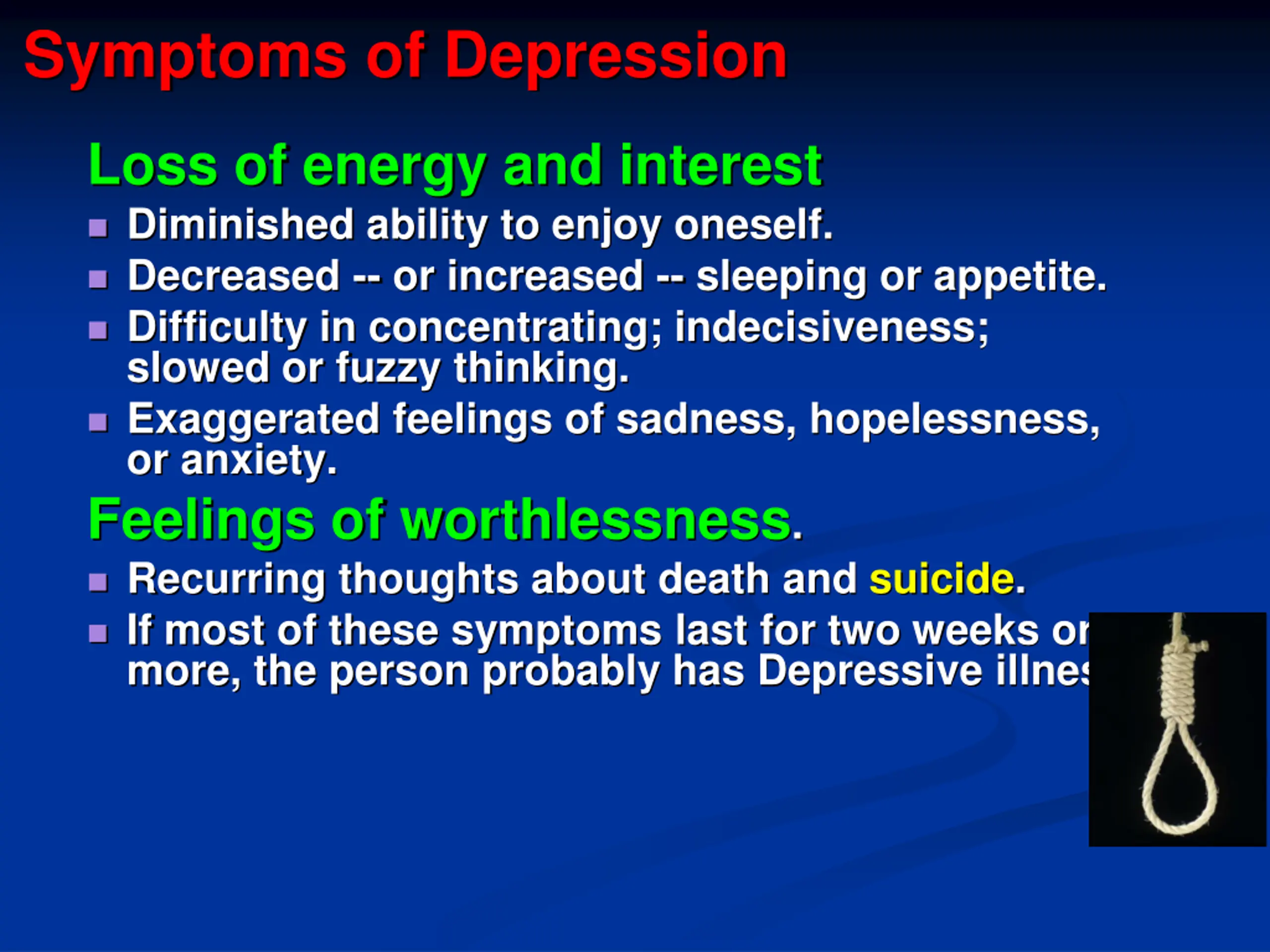Symptoms of Depression Loss of energy and interest Diminished ability to enjoy oneself. Decreased -- or increased -- sleeping or appetite. Difficulty in concentrating; indecisiveness; slowed or fuzzy thinking. Exaggerated feelings of sadness, hopelessness, or anxiety. Feelings of worthlessness. Recurring thoughts about death and suicide. If most of these symptoms last for two weeks or more, the person probably has Depressive illness.