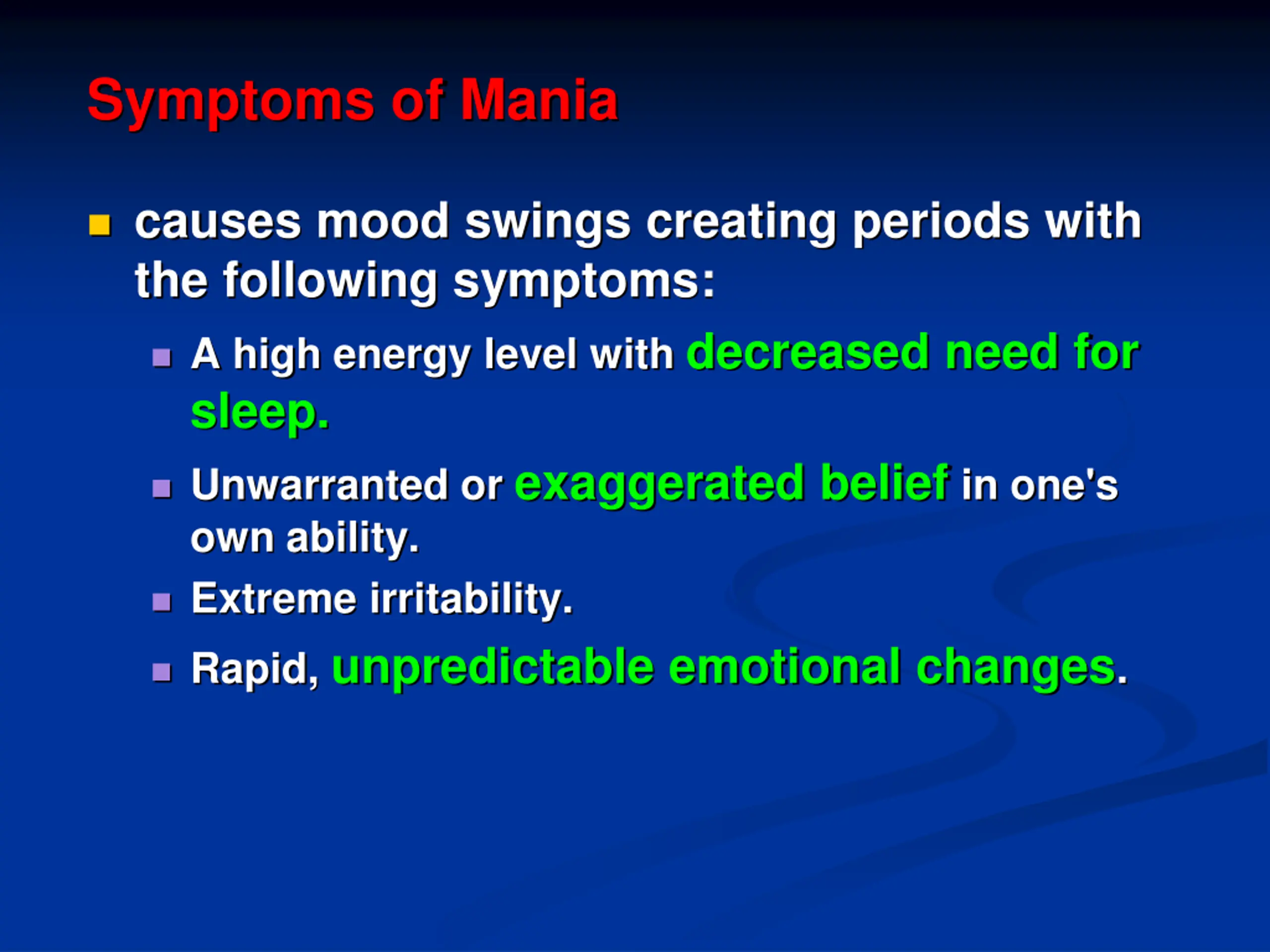 Symptoms of Mania causes mood swings creating periods with the following symptoms: A high energy level with decreased need for sleep. Unwarranted or exaggerated belief in one's own ability. Extreme irritability. Rapid, unpredictable emotional changes.