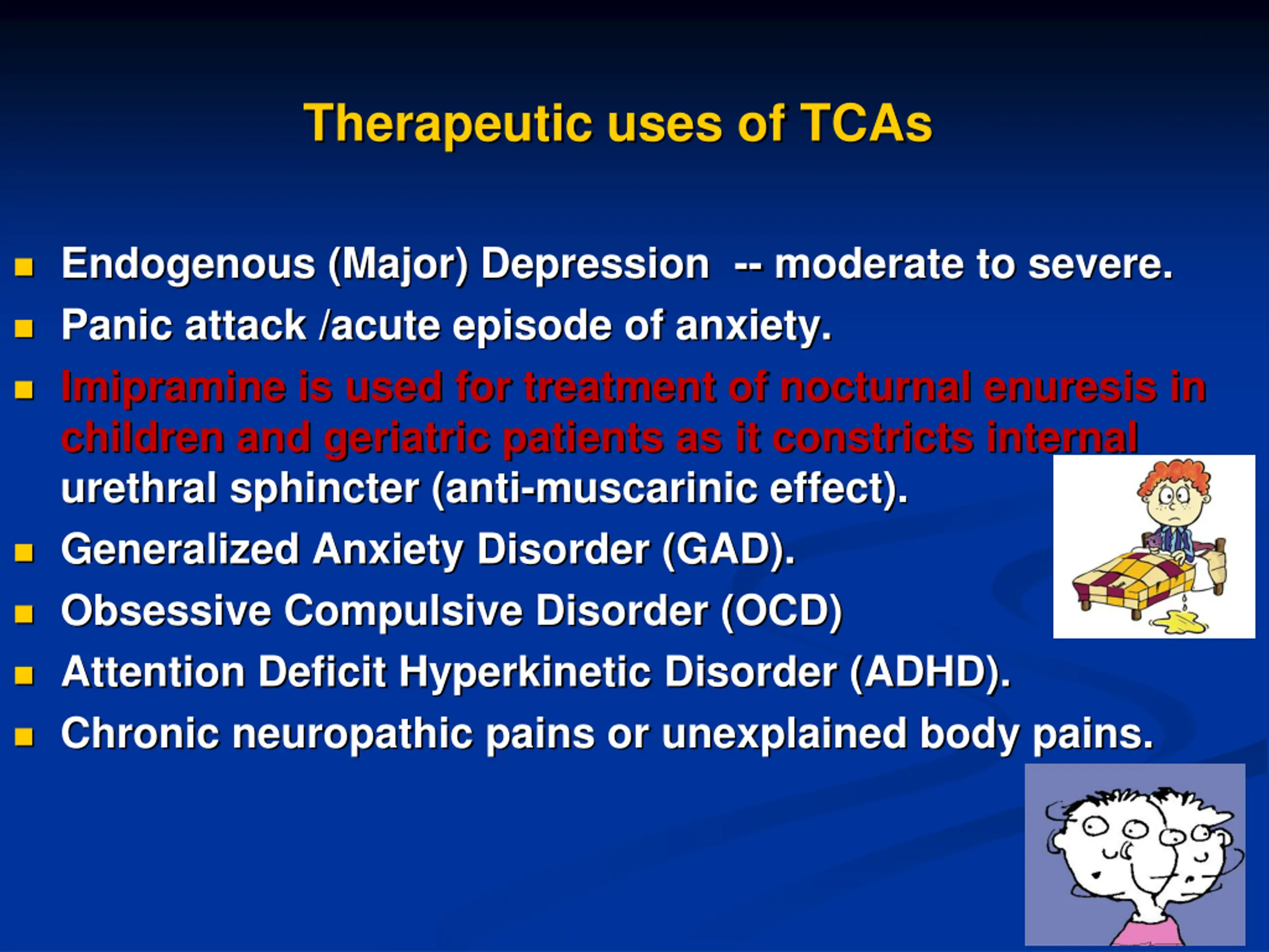Therapeutic uses of TCAs Endogenous (Major) Depression -- moderate to severe. Panic attack /acute episode of anxiety. Imipramine is used for treatment of nocturnal enuresis in children and geriatric patients as it constricts internal urethral sphincter (anti-muscarinic effect). Generalized Anxiety Disorder (GAD). Obsessive Compulsive Disorder (OCD) Attention Deficit Hyperkinetic Disorder (ADHD). Chronic neuropathic pains or unexplained body pains.