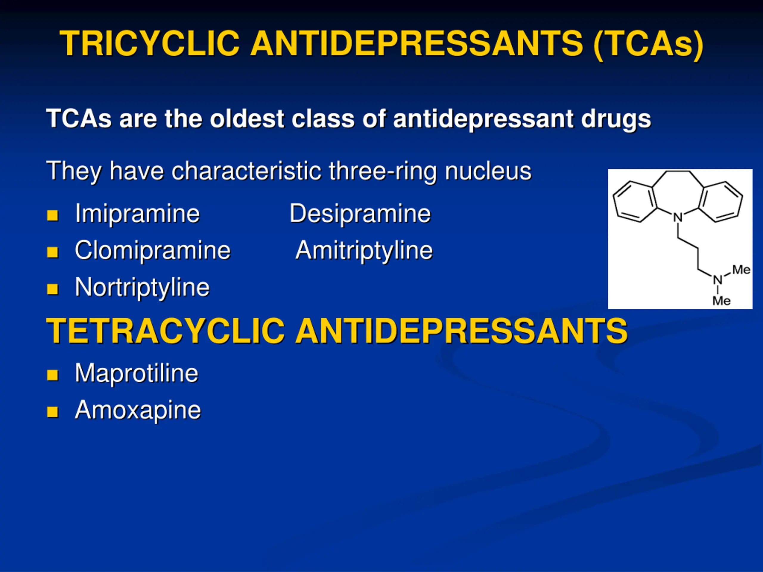 TRICYCLIC ANTIDEPRESSANTS (TCAs) TCAs are the oldest class of antidepressant drugs They have characteristic three-ring nucleus Imipramine Clomipramine Amitriptyline Nortriptyline TETRACYCLIC ANTIDEPRESSANTS Maprotiline Amoxapine Desipramine