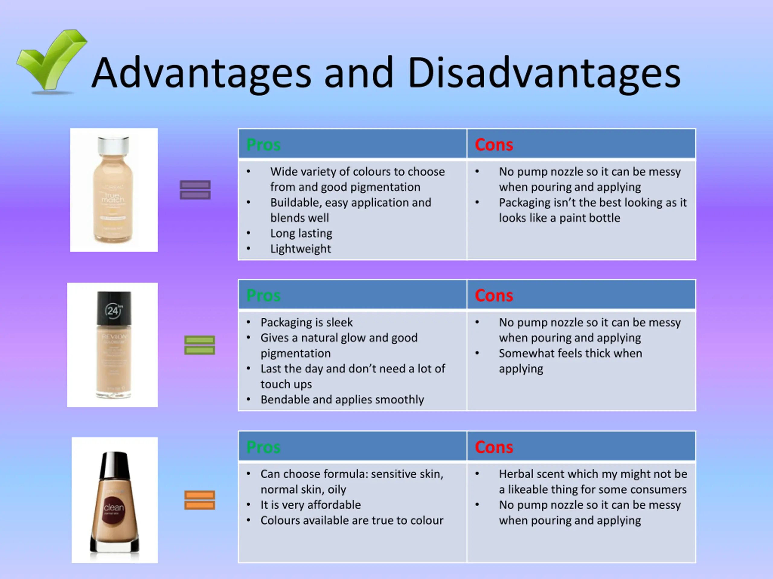 Advantages and Disadvantages Pros Cons Wide variety of colours to choose from and good pigmentation Buildable, easy application and blends well Long lasting Lightweight No pump nozzle so it can be messy when pouring and applying Packaging isn t the best looking as it looks like a paint bottle Pros Cons Packaging is sleek Gives a natural glow and good pigmentation Last the day and don t need a lot of touch ups Bendable and applies smoothly No pump nozzle so it can be messy when pouring and applying Somewhat feels thick when applying Pros Cons Can choose formula: sensitive skin, normal skin, oily It is very affordable Colours available are true to colour Herbal scent which my might not be a likeable thing for some consumers No pump nozzle so it can be messy when pouring and applying
