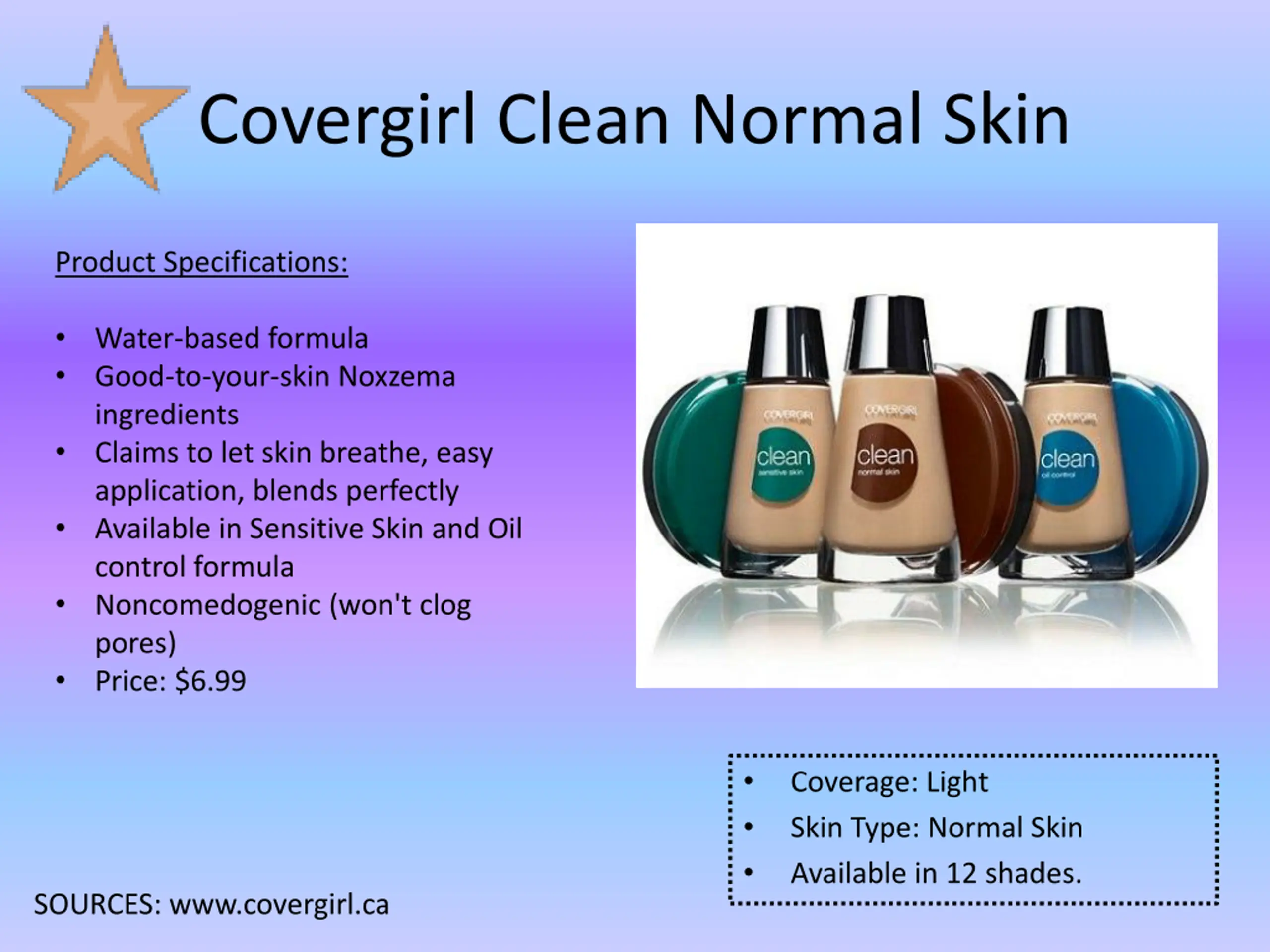 Covergirl Clean Normal Skin Product Specifications: Water-based formula Good-to-your-skin Noxzema ingredients Claims to let skin breathe, easy application, blends perfectly Available in Sensitive Skin and Oil control formula Noncomedogenic (won't clog pores) Price: $6.99 Coverage: Light Skin Type: Normal Skin Available in 12 shades. SOURCES: www.covergirl.ca