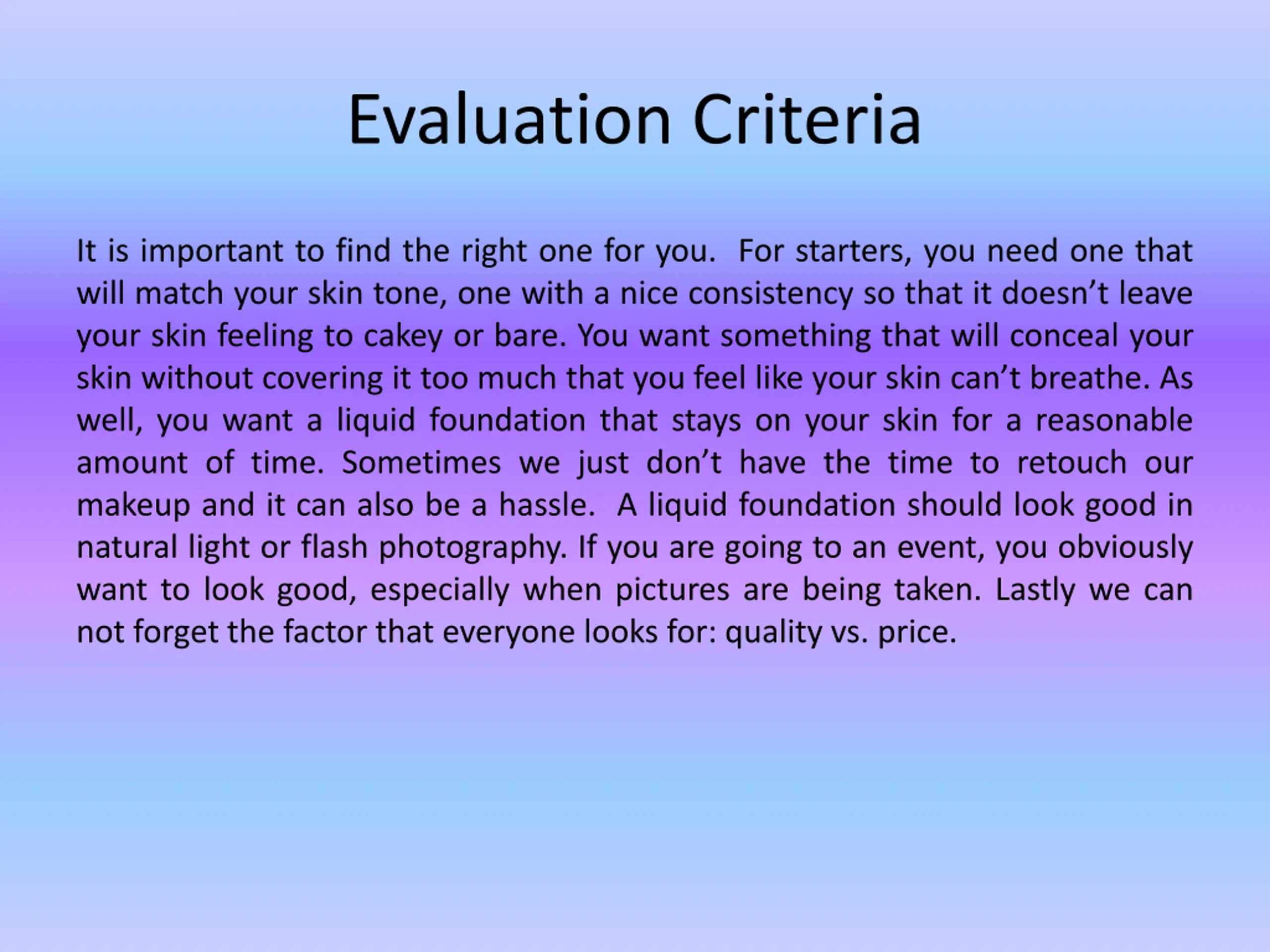 Evaluation Criteria It is important to find the right one for you. For starters, you need one that will match your skin tone, one with a nice consistency so that it doesn t leave your skin feeling to cakey or bare. You want something that will conceal your skin without covering it too much that you feel like your skin can t breathe. As well, you want a liquid foundation that stays on your skin for a reasonable amount of time. Sometimes we just don t have the time to retouch our makeup and it can also be a hassle. A liquid foundation should look good in natural light or flash photography. If you are going to an event, you obviously want to look good, especially when pictures are being taken. Lastly we can not forget the factor that everyone looks for: quality vs. price.