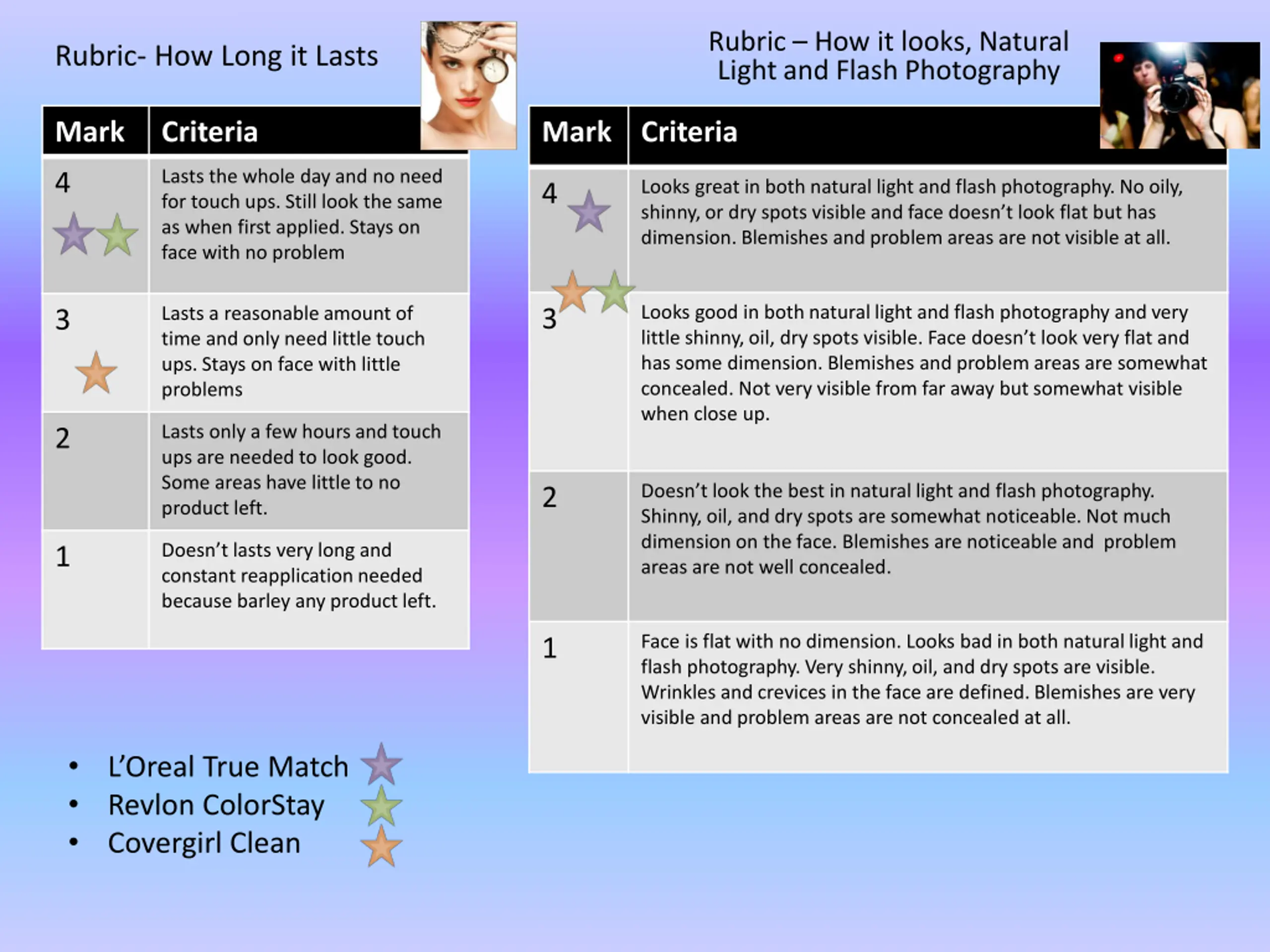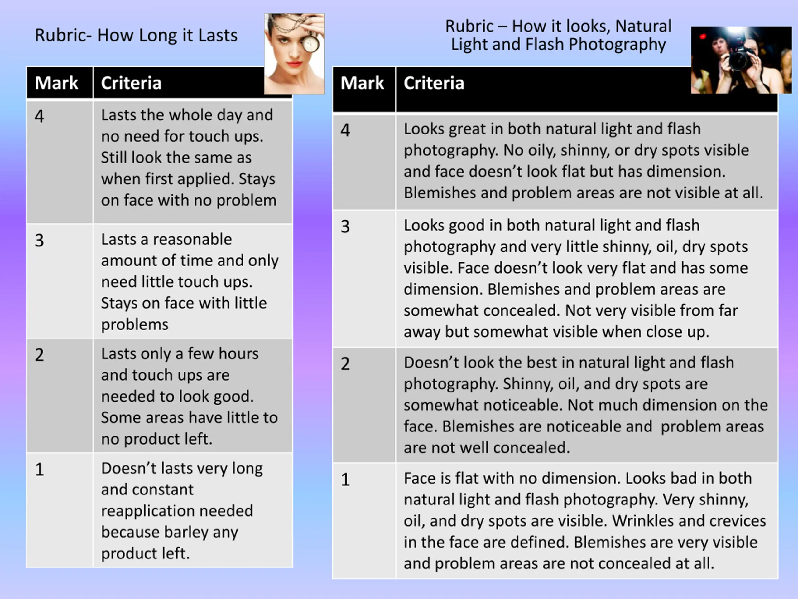 Rubric How it looks, Natural Light and Flash Photography Rubric- How Long it Lasts Mark Criteria Mark Criteria Lasts the whole day and no need for touch ups. Still look the same as when first applied. Stays on face with no problem 4 Looks great in both natural light and flash photography. No oily, shinny, or dry spots visible and face doesn t look flat but has dimension. Blemishes and problem areas are not visible at all. 4 Looks good in both natural light and flash photography and very little shinny, oil, dry spots visible. Face doesn t look very flat and has some dimension. Blemishes and problem areas are somewhat concealed. Not very visible from far away but somewhat visible when close up. 3 Lasts a reasonable amount of time and only need little touch ups. Stays on face with little problems 3 Lasts only a few hours and touch ups are needed to look good. Some areas have little to no product left. 2 Doesn t look the best in natural light and flash photography. Shinny, oil, and dry spots are somewhat noticeable. Not much dimension on the face. Blemishes are noticeable and problem areas are not well concealed. 2 Doesn t lasts very long and constant reapplication needed because barley any product left. 1 Face is flat with no dimension. Looks bad in both natural light and flash photography. Very shinny, oil, and dry spots are visible. Wrinkles and crevices in the face are defined. Blemishes are very visible and problem areas are not concealed at all. 1