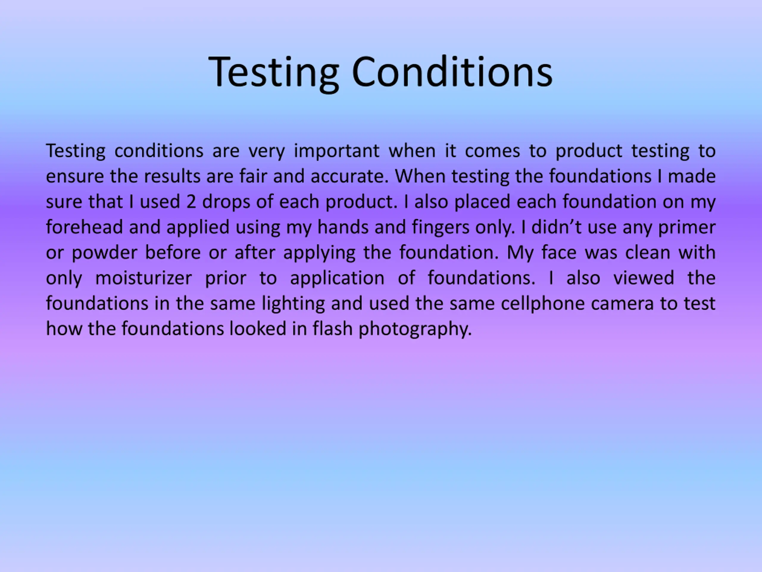 Testing Conditions Testing conditions are very important when it comes to product testing to ensure the results are fair and accurate. When testing the foundations I made sure that I used 2 drops of each product. I also placed each foundation on my forehead and applied using my hands and fingers only. I didn t use any primer or powder before or after applying the foundation. My face was clean with only moisturizer prior to application of foundations. I also viewed the foundations in the same lighting and used the same cellphone camera to test how the foundations looked in flash photography.
