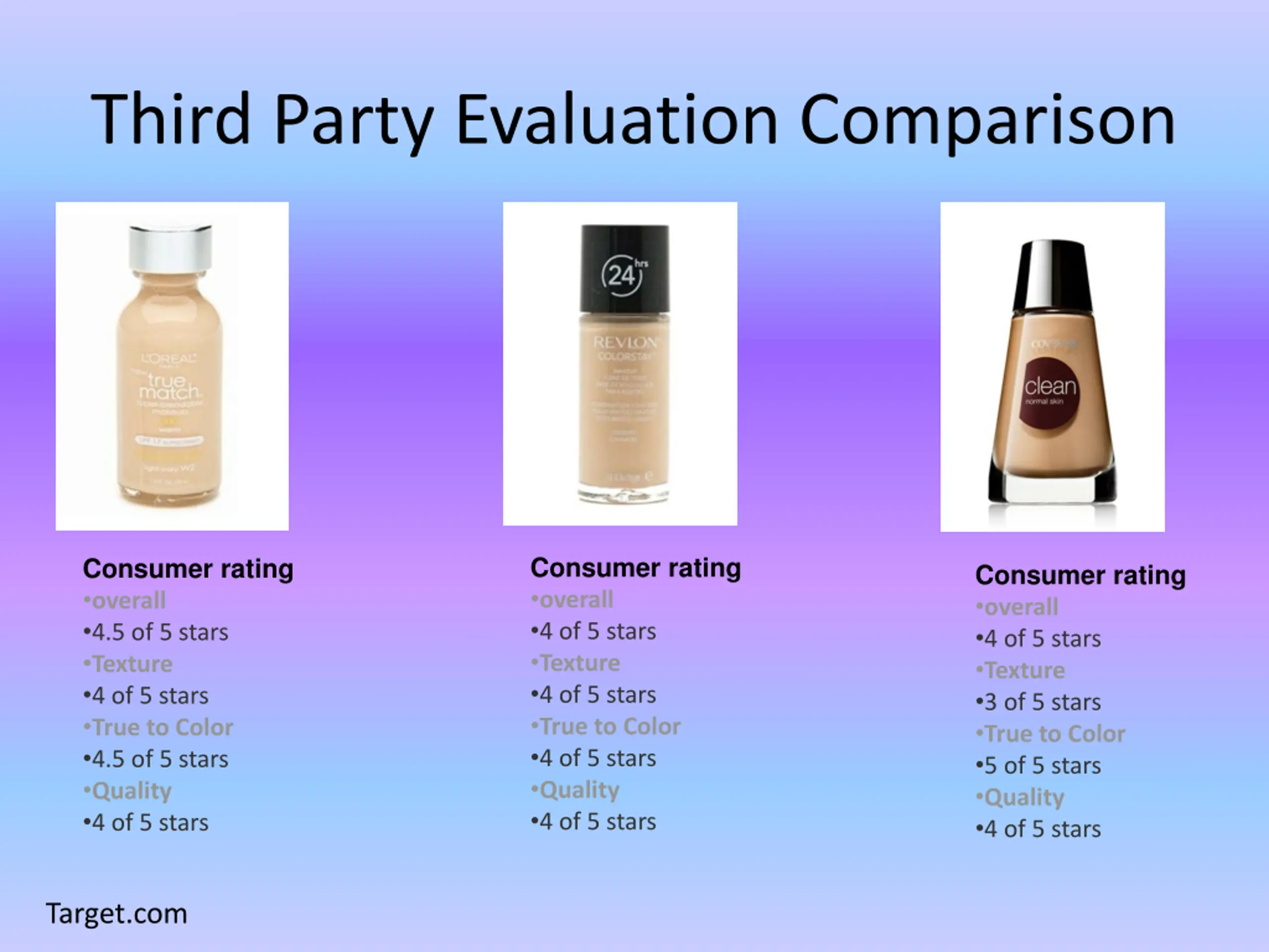 Third Party Evaluation Comparison Consumer rating overall 4 of 5 stars Texture 4 of 5 stars True to Color 4 of 5 stars Quality 4 of 5 stars Consumer rating overall 4.5 of 5 stars Texture 4 of 5 stars True to Color 4.5 of 5 stars Quality 4 of 5 stars Consumer rating overall 4 of 5 stars Texture 3 of 5 stars True to Color 5 of 5 stars Quality 4 of 5 stars Target.com