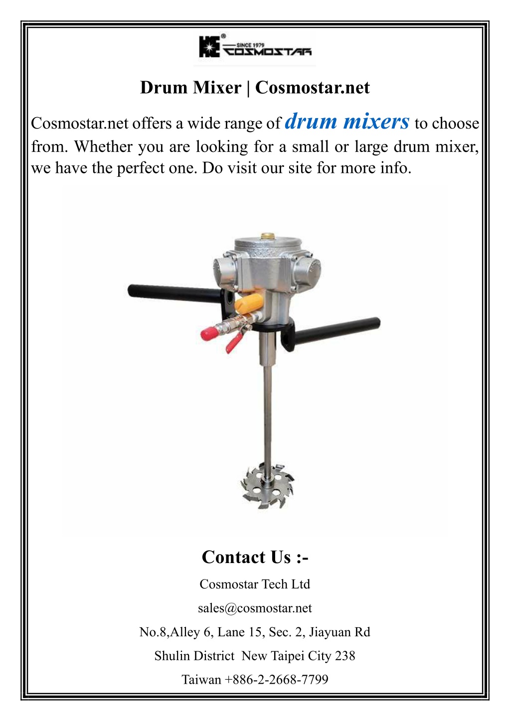 Drum Mixer | Cosmostar.net Cosmostar.net offers a wide range of drum mixersto choose from. Whether you are looking for a small or large drum mixer, we have the perfect one. Do visit our site for more info. Contact Us :- Cosmostar Tech Ltd sales@cosmostar.net No.8,Alley 6, Lane 15, Sec. 2, Jiayuan Rd Shulin District New Taipei City 238 Taiwan +886-2-2668-7799